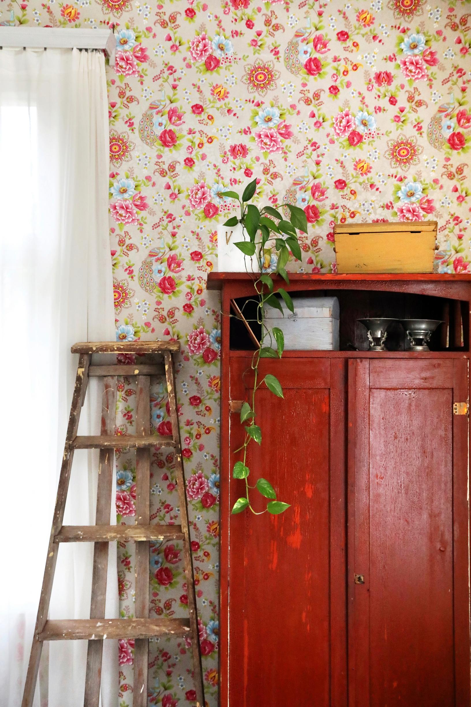 - Sovita sisustukseen. Pidä yhtenäinen värilinja. Maalasin keittiön emännänkaapin viikunanliilaksi sävyllä, jonka nappasin tapetin kuviosta.