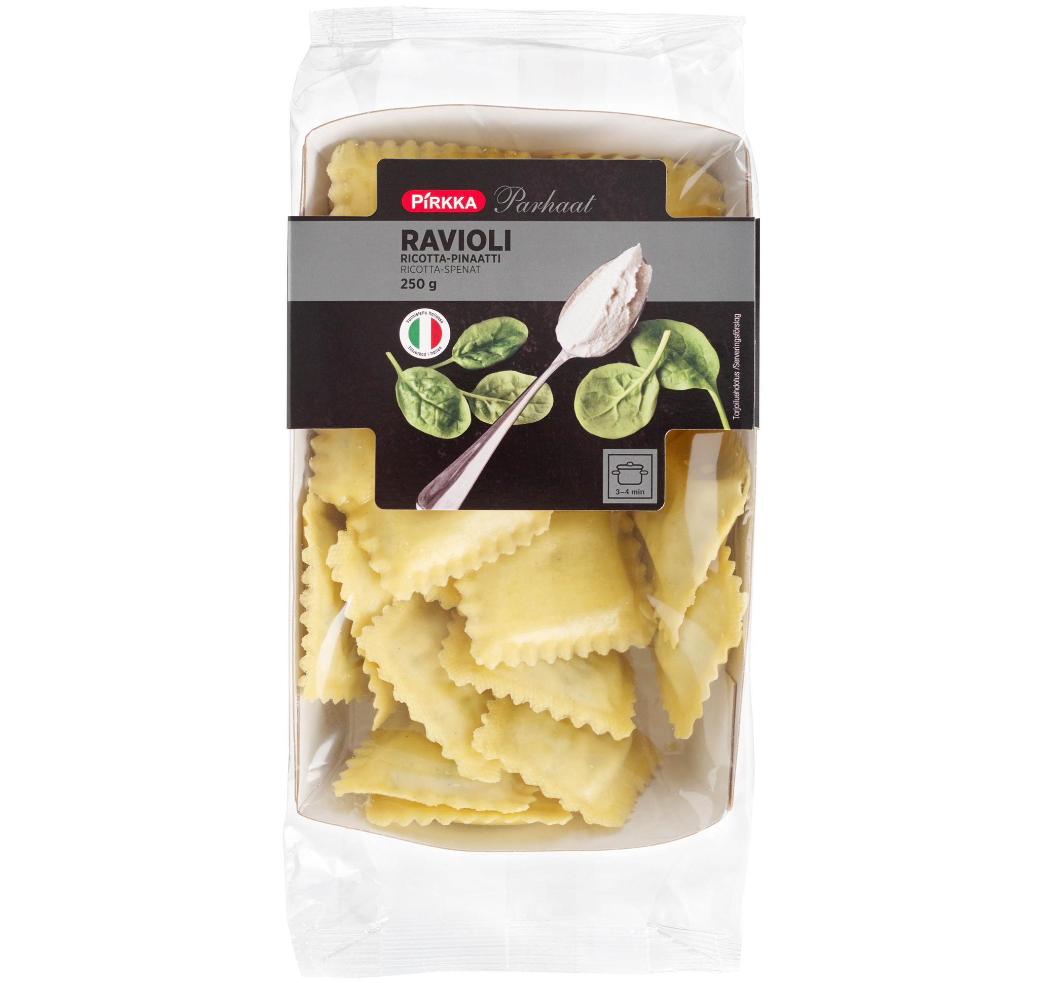 Pirkka-raviolit (esim. ricotta-pinaatti tai neljän juuston) "Nämä ovat valmiit parissa minuutissa. Laitan pannulle öljyä, valkosipulia, kirsikkatomaatteja ja basilikaa. Kun tomaatit ovat pehmenneet, heitän perään raviolit, pyörittelen pannulla nopeasti ja kippaan lautaselle. Viimeistelen revityllä mozzarellalla."