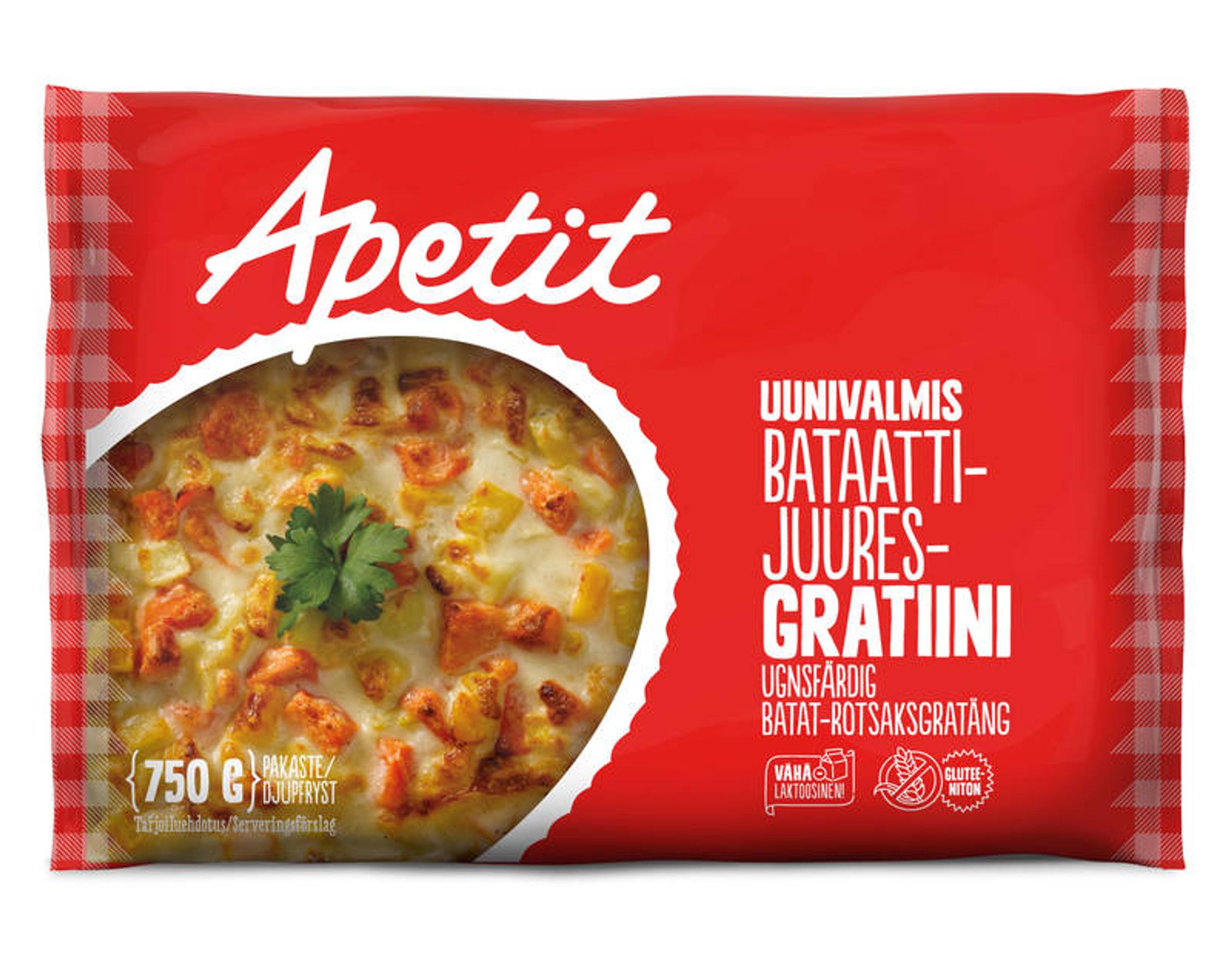 Apetit bataatti-juuresgratiini "Lisään gratiiniin kalkkunasuikaleita ja vielä lorauksen ruokakermaa – herkkukiusaus on valmis uuniin. Kypsennän pakkauksen ohjeen mukaan. "