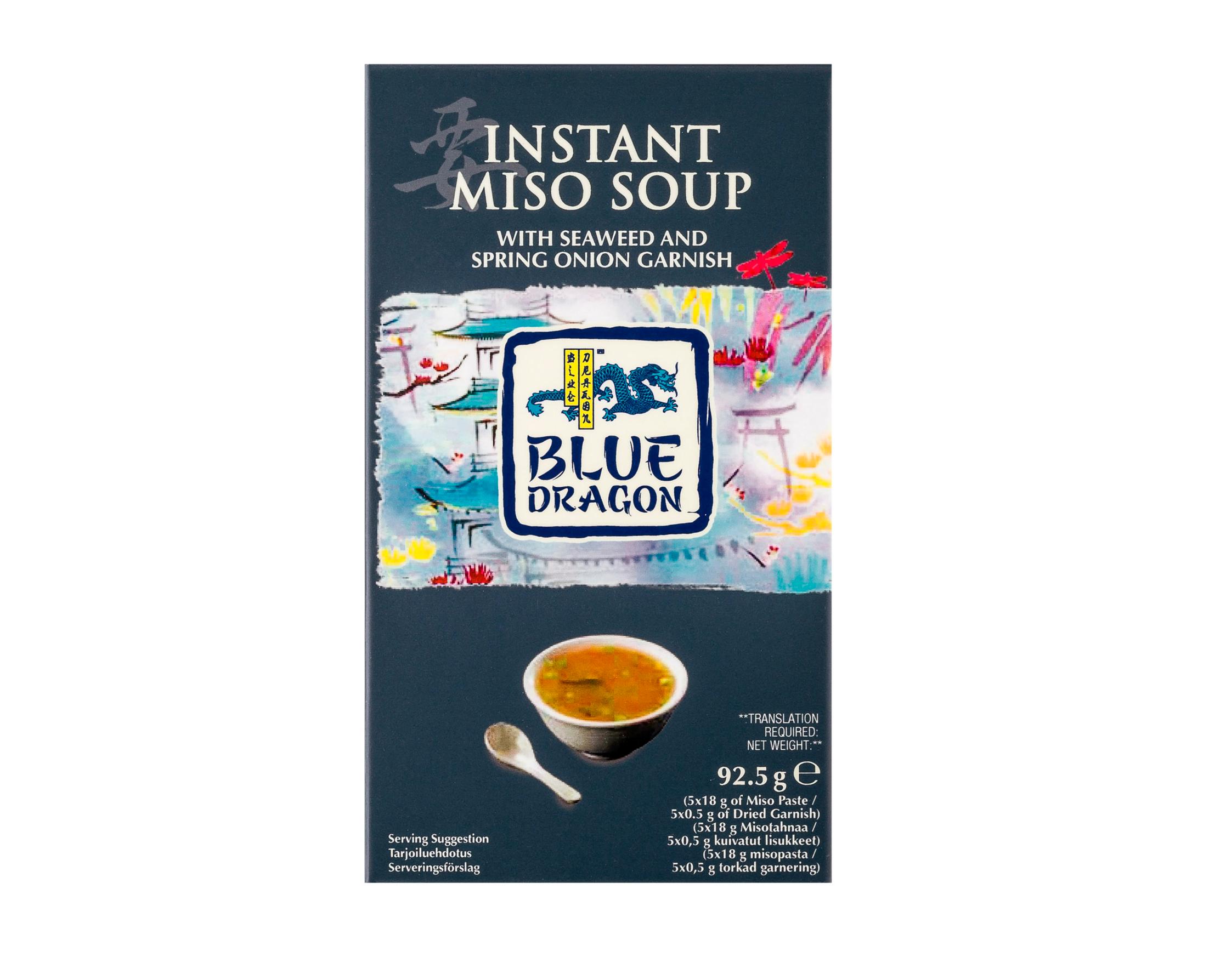 Blue Dragon -misokeittopussi "Misokeittopussista saa nopeasti maukkaan ramenkeittoliemen eli keitä vesi ja lisää misopussin sisältö. Heitä kiehuvan kuumaan veteen myös nuudelit ja haluamasi täytteet oman maun mukaan: sulatetut pakastekatkaravut, edellisen päivän broilerin tähteet, keitetty kananmuna, kiinankaali, paksoi, pavut, herneet, porkkanasuikaleet, tuoreet kevätsipulirenkaat…"