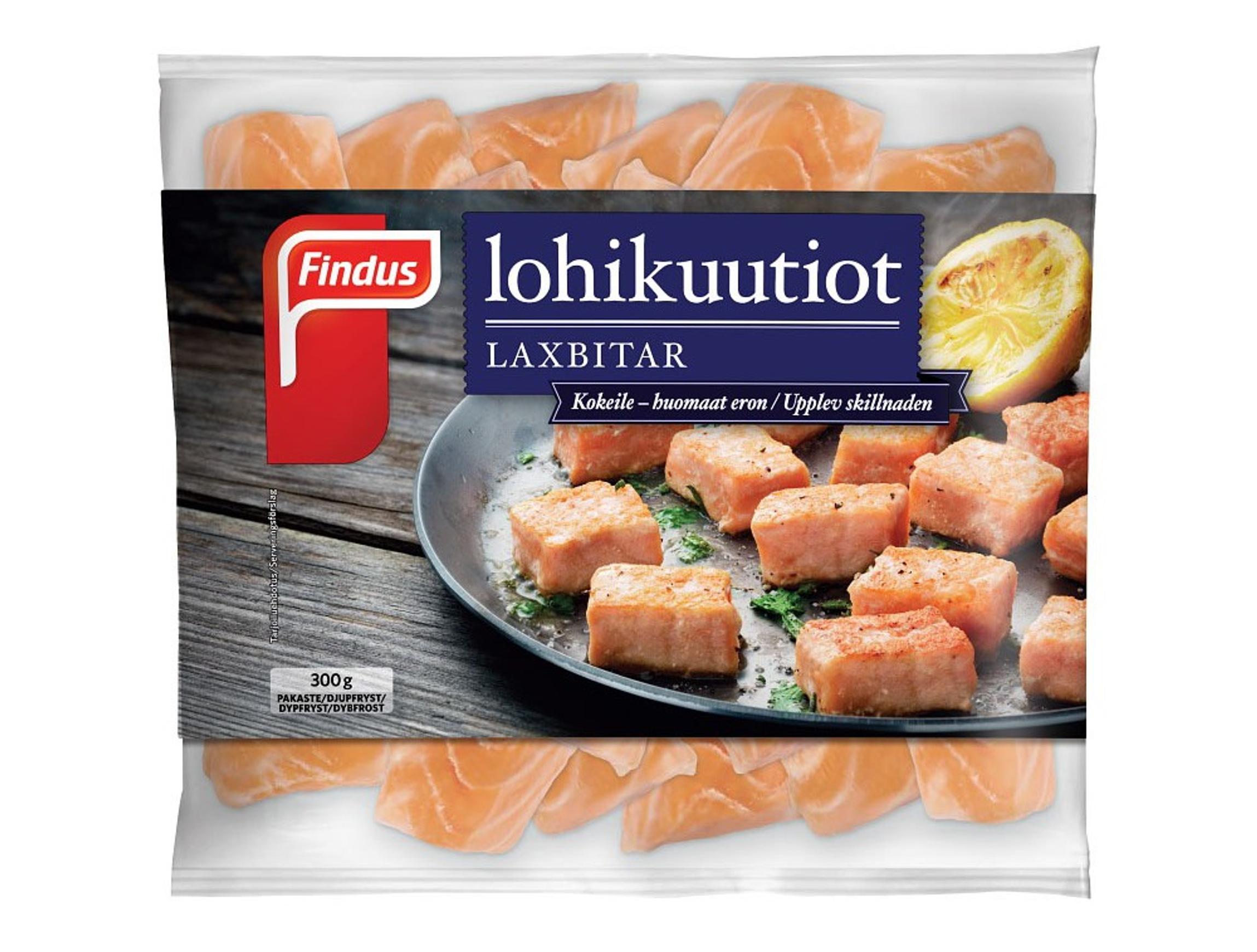Valmiit lohikuutiot, esim. Findus "Teen lapselle kalakeiton laiskimmillani niin että ostan pakasteesta pussin peruna-keittojuuressekoitusta ja lohikuutioita. Laitan ne kattilaan liemikuution ja laakerinlehden ja maustepippurien kanssa."