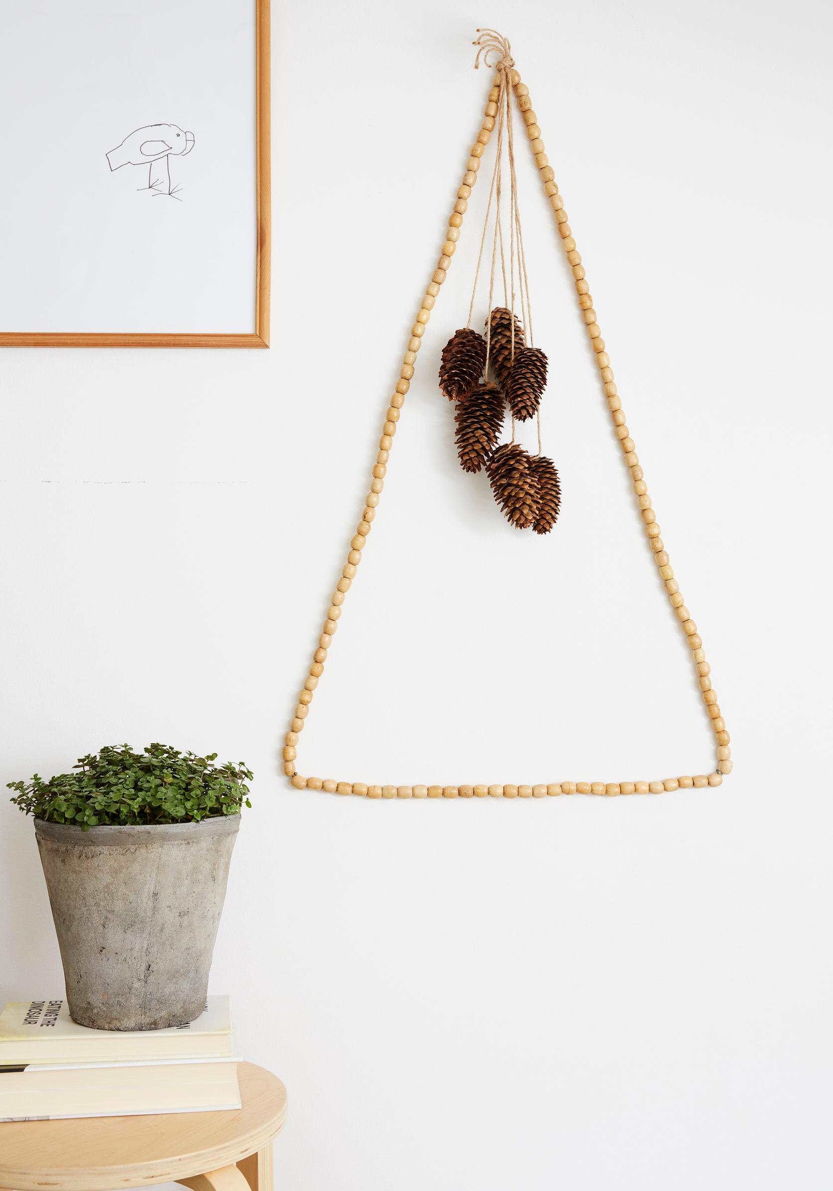 - Avaa alkuun tekemäsi solmu, venytä kuminauhaa, solmi päät yhteen ja leikkaa ylimääräiset pois. Aseta helminauha kuuseksi naulojen ympärille. Ripusta kärkinaulaan koristenippu.