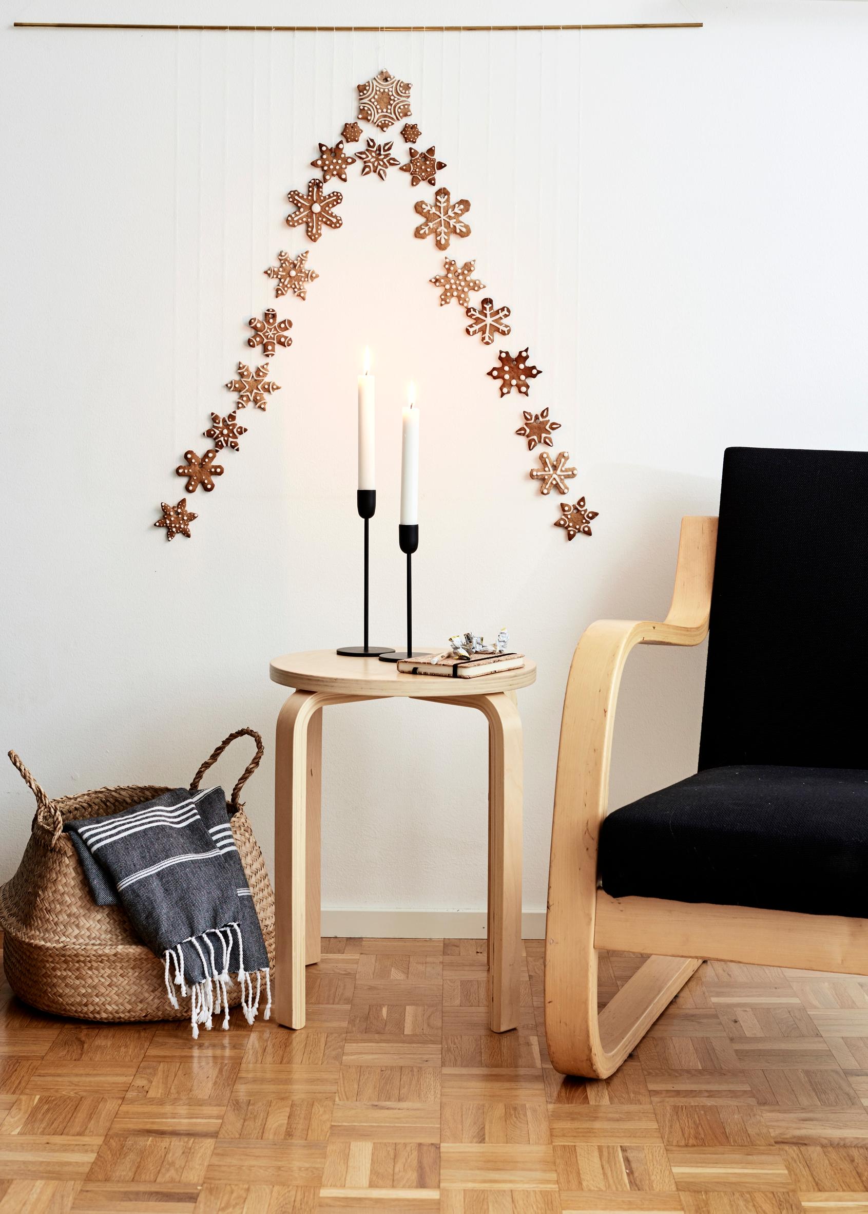 - Nosta piparikuusi seinälle, kääntele piparit oikein päin, säädä ripustusnaruja ja leikkaa ylimääräiset langanpäät pois.