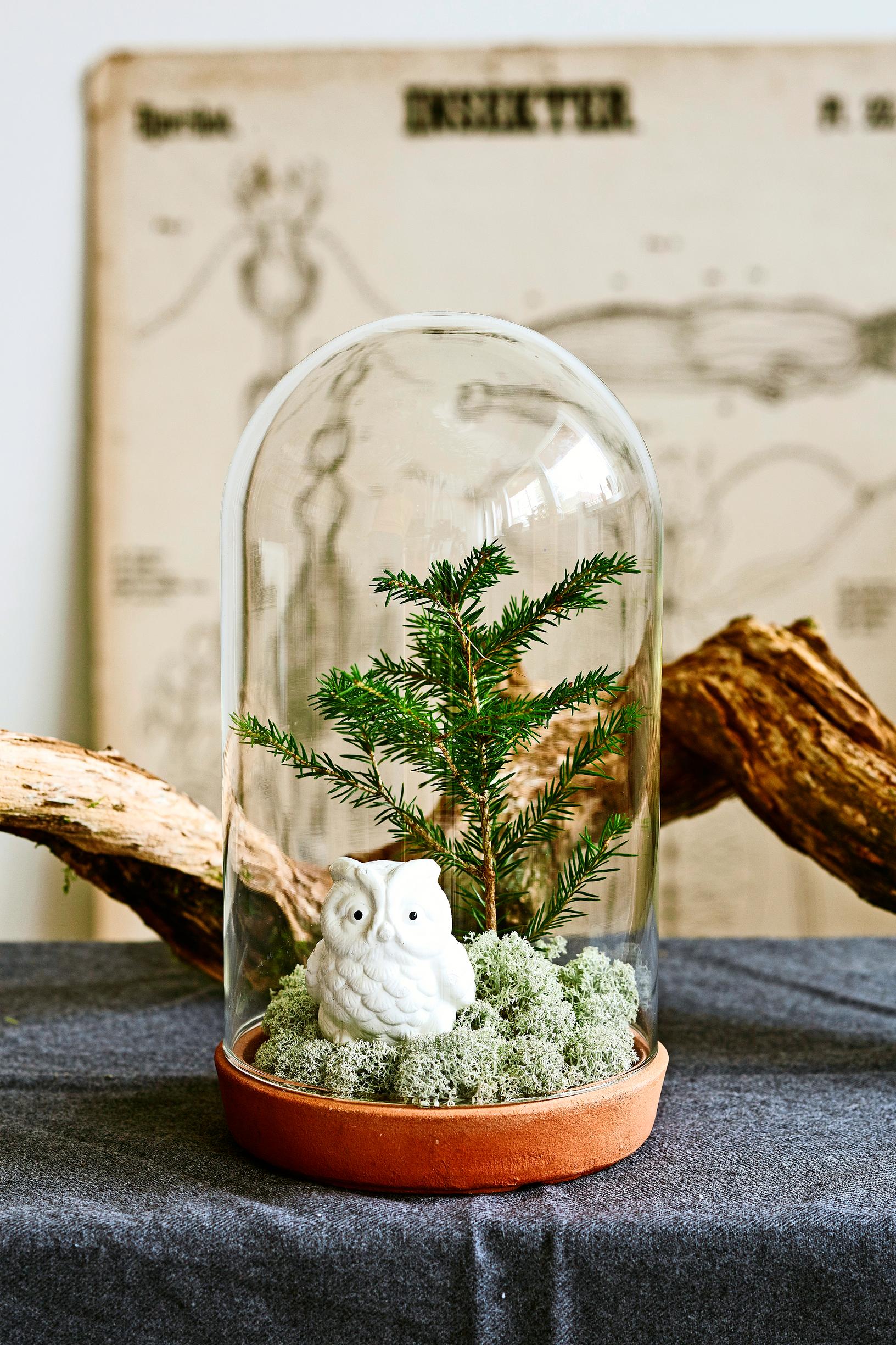 Lautanen, kellokupu ja pöllö ovat kirpputorilta. Vastaavia kupuja aluslautasella on saatavana sisutustarvikkeita myyvistä kaupoista ja tavarataloista. Lelukauppojen muovieläimet sopivat hyvin koristeiksi kuvun alle.