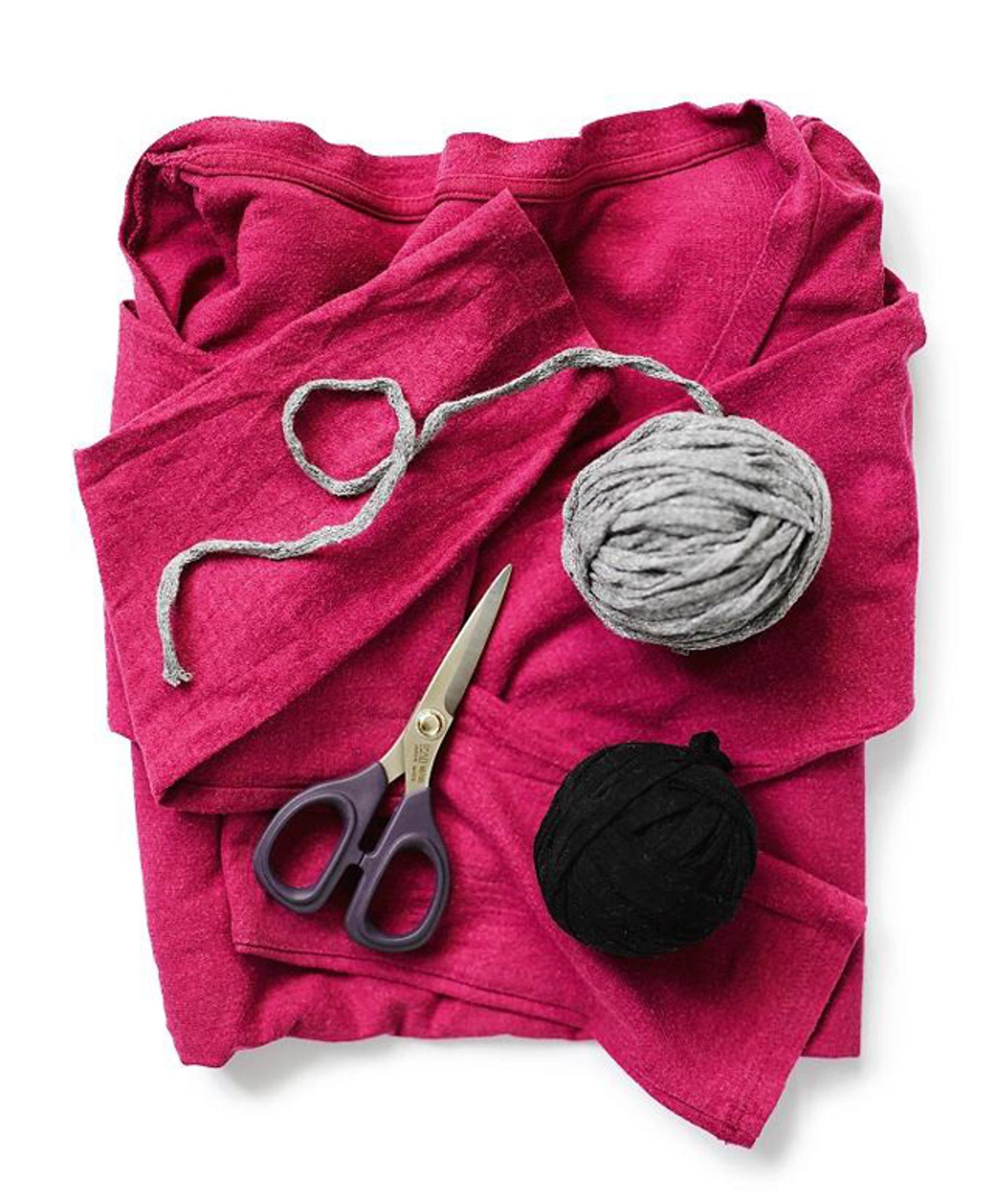 1. Pese ja kuivata vaate tai kangas hyvin. 2. Leikkaa vaate terävillä saksilla saumojen vierestä auki irrallisiksi kappaleiksi. Irrota taskut, kaulukset ja hihansuut. Talleta napit ja vetoketjut, voit hyödyntää niitä myöhemmin. 3. Trikoovaatteita ja -kankaita voi leikata: – Vinosti neulokseen nähden, jolloin kude ei veny. – Spiraalina keskeltä aloittaen, jolloin kuteeseen ei tule kolmionmuotoisia käännöskohtia. – Trikooneuloksen langansuunnan mukaisesti, jolloin kudetta venyttämällä sen reunat kiertyvät sisälle, kude on joustavaa ja putkimaista. 4. Kun leikkaat räsykudetta, jätä käännöskohtiin reilusti kangasta, ettei kude katkea. Noin 1 cm:n levyinen kude sopii asusteisiin, koska sitä on helppo virkata ja neuloa. Jos haluat tehdä tuhdimman työn, kuten maton tai korin, leikkaa kude 2 cm:n levyiseksi. 5. Keri räsykude.