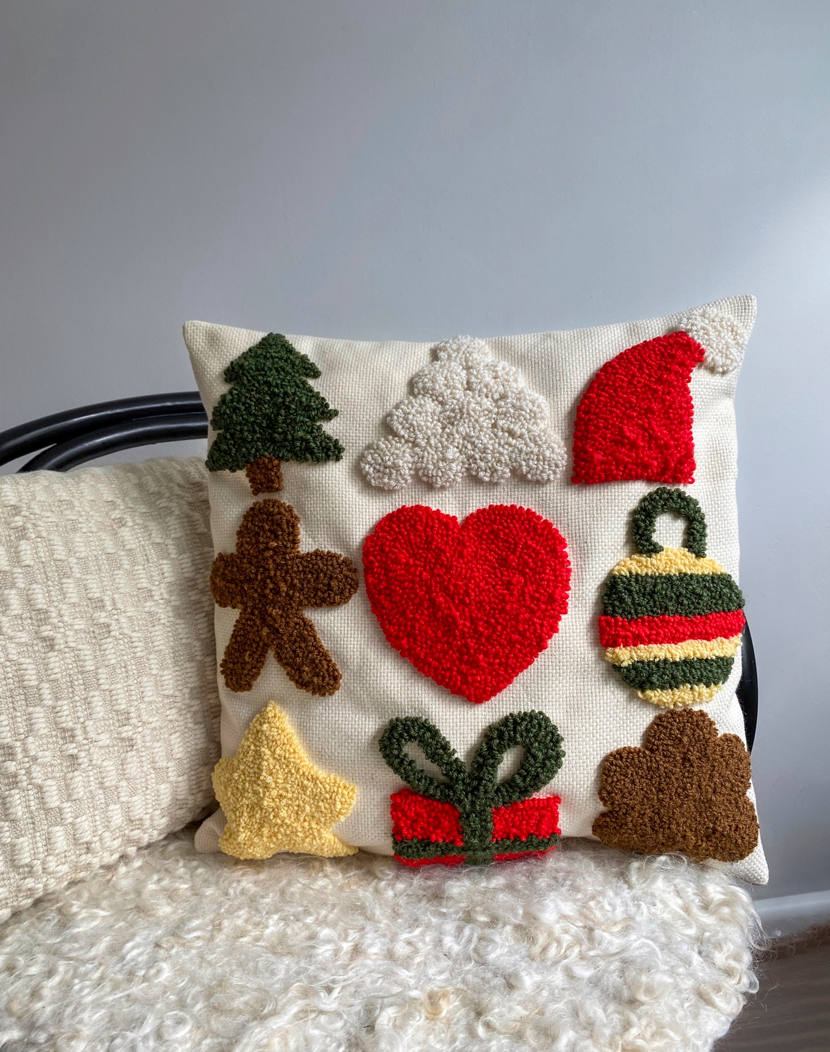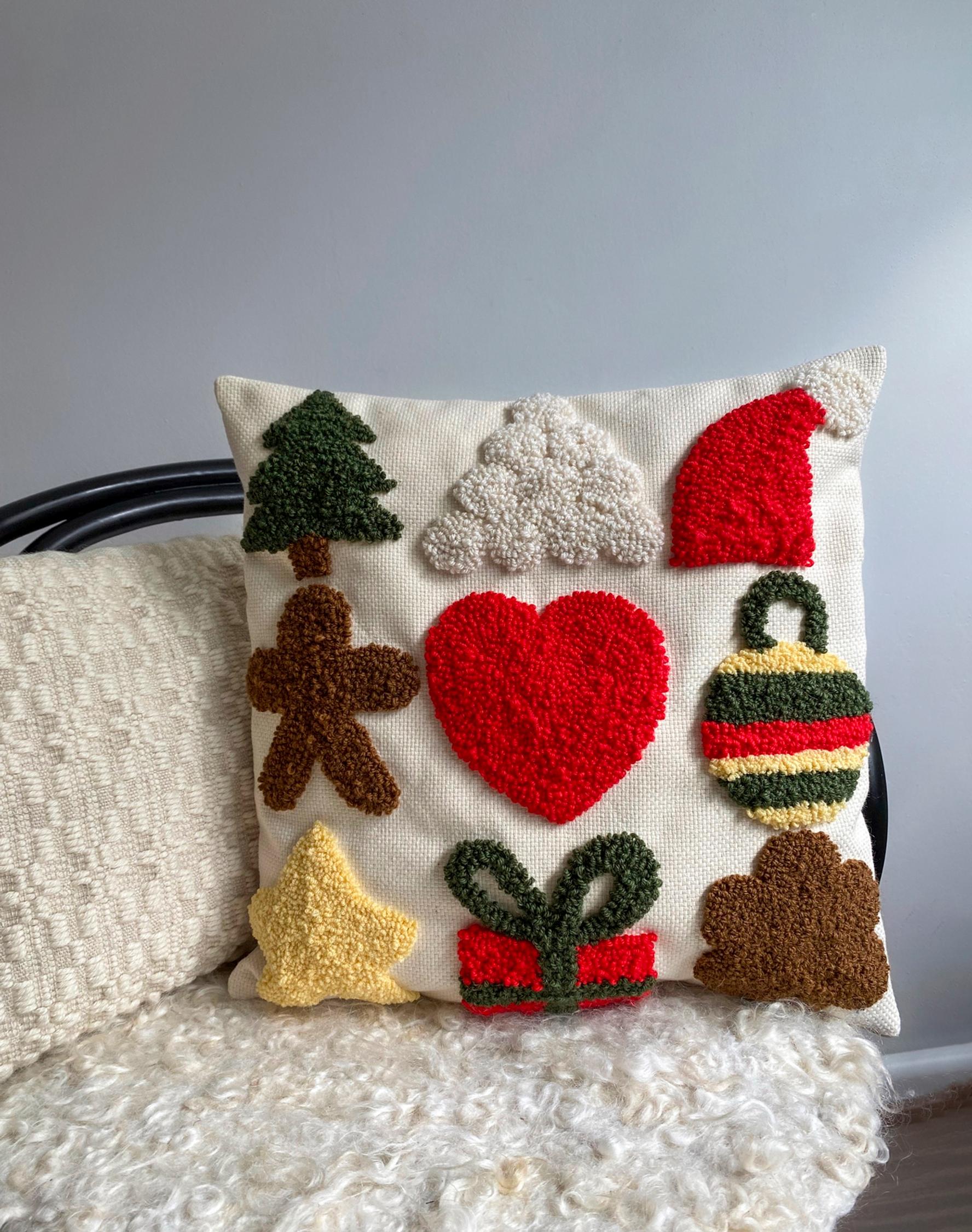 Siliteltävän pehmeä joulutyyny on löhönurkan luottokaveri – kuviot teet helposti tuftaamalla