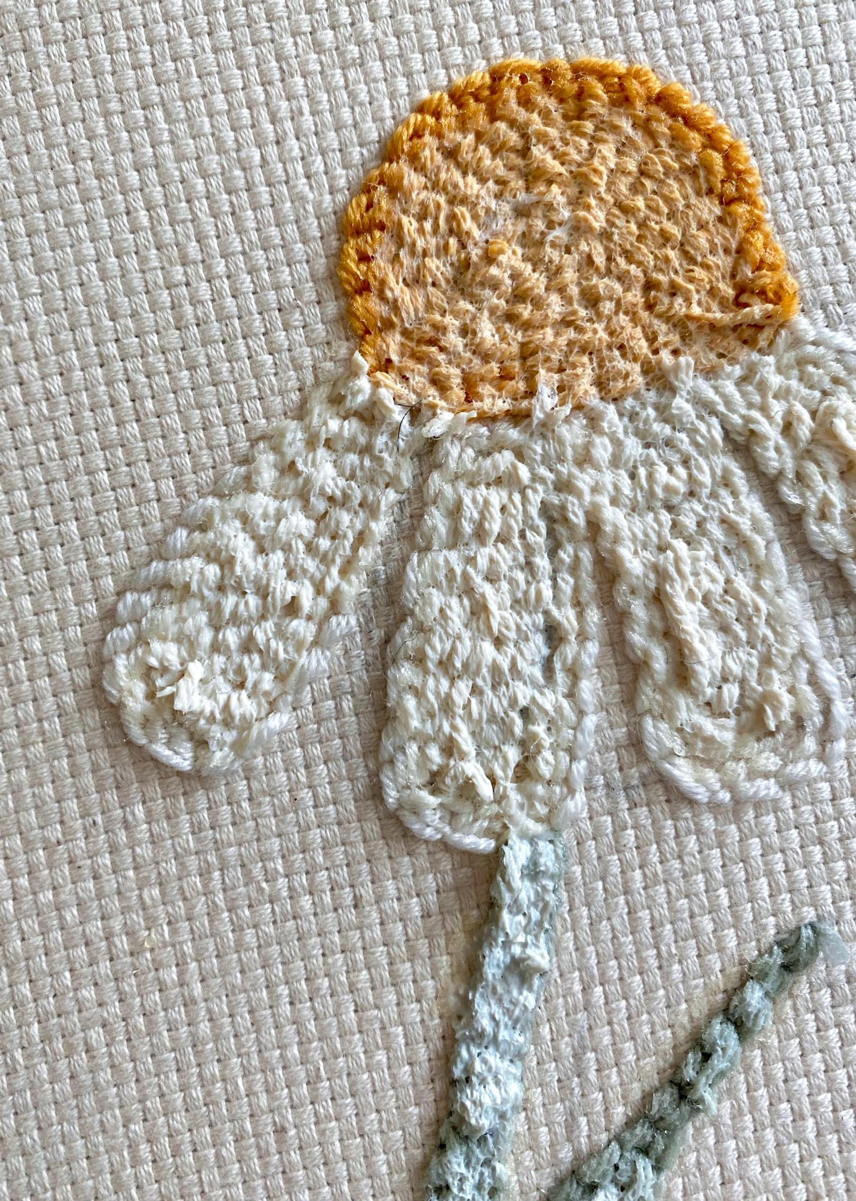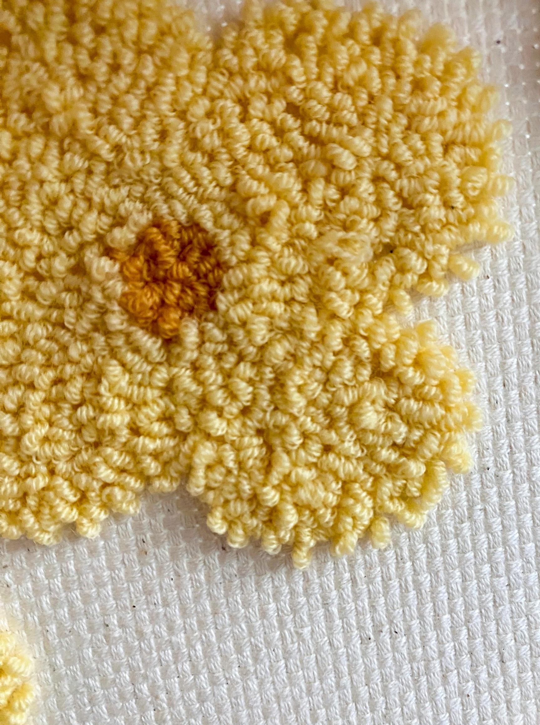 4. Tuftaa osio kerrallaan lankojen paksuuteen sopivalla neulalla. Tee ensin esim. yhden terälehden ääriviivat ja täytä aluetta kohti keskiosaa. Lehdissä tee ensin ruodit ja sitten muut alueet. Tarkista tiheys työn oikealta puolelta. Tiheys on hyvä, kun pohjakangasta ei näy tuftattavalta alueelta.