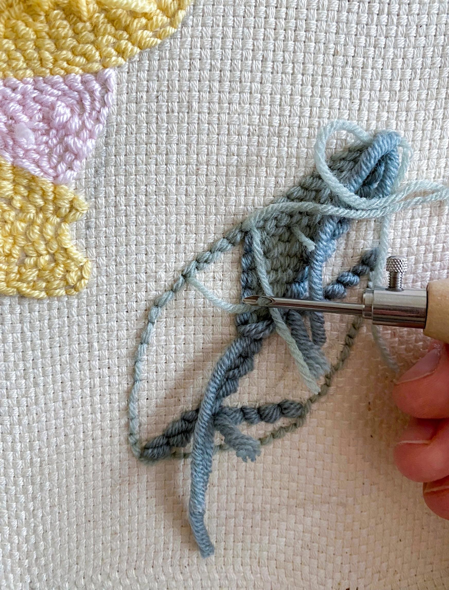3. Aseta neulan pohja tasaan kädensijan kanssa. Koko työ tuftataan tällä nukan korkeudella, mutta halutessasi voit leikitellä korkeuseroilla.