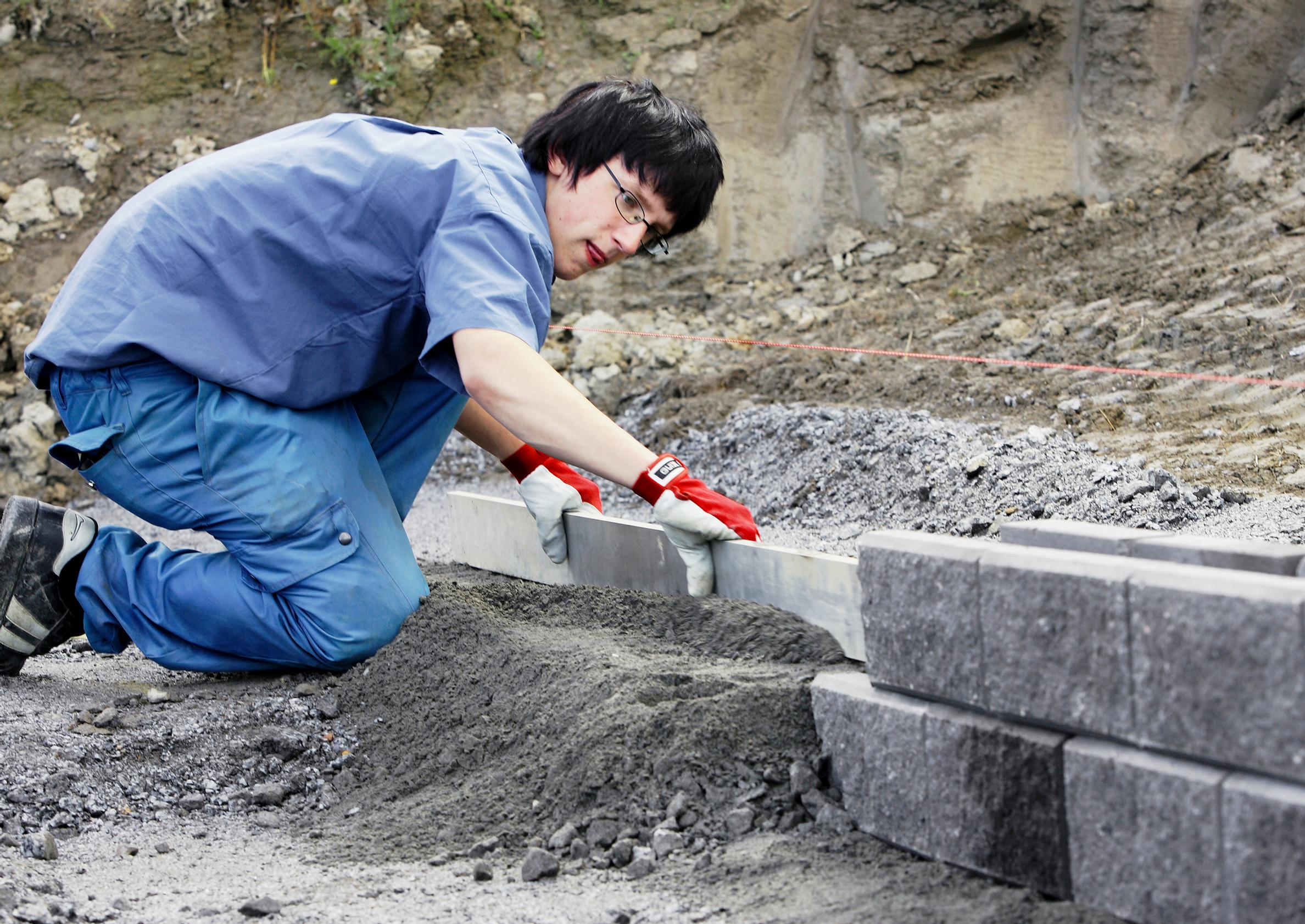 8. Muurikiven asennus aloitetaan alimman muurinosan alapäästä. Suora linja saadaan käyttäen apuna linjalankaa. Ensimmäisen kivikerroksen sijainti ratkaisee muurin kohdan. Kaarevilla osuuksilla muurin oikea paikka määritellään erilaisilla mittauksilla. Kivet asennetaan kohdalleen. Alimman kivikerroksen asennuksen jälkeen muuria ei voi enää siirtää sivusuunnassa.