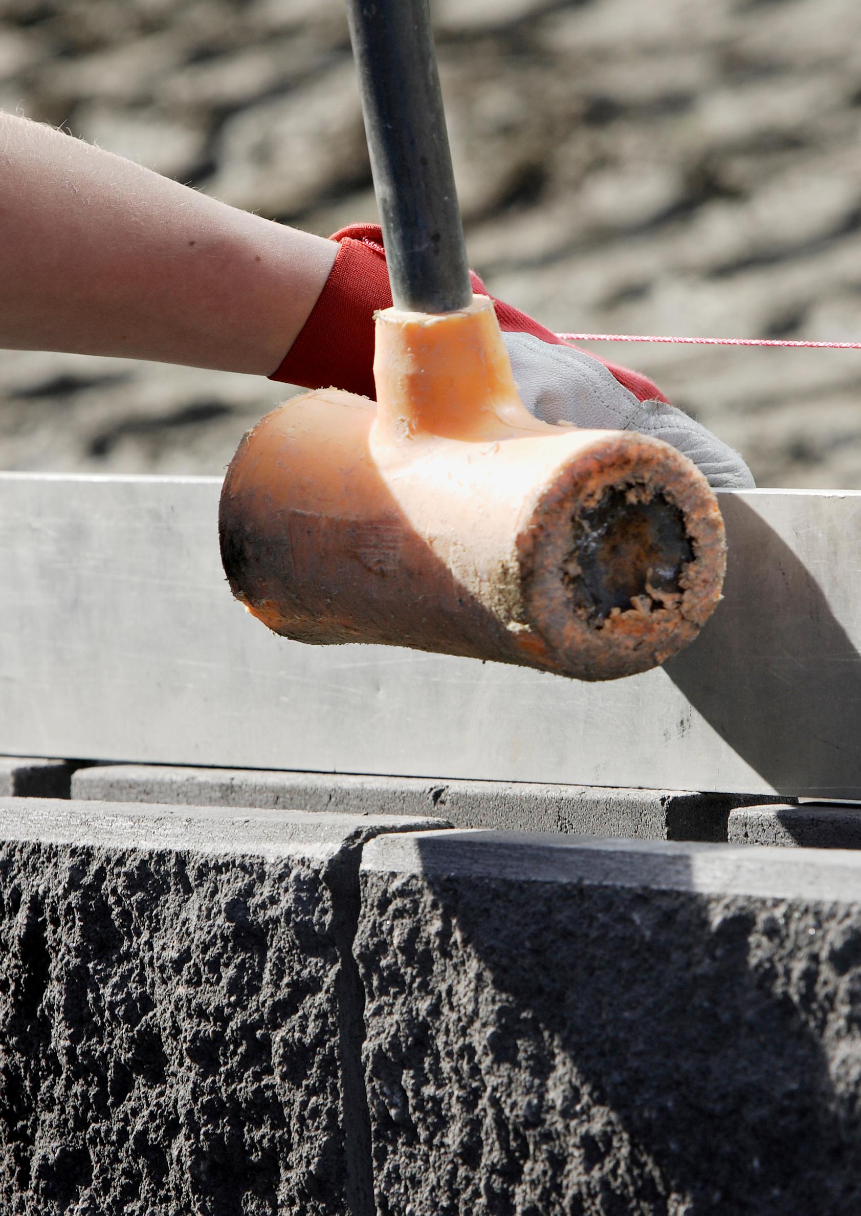 9. Kun toista kerrosta asennetaan, on otettava huomioon, että kivet asennetaan limittäin: pystysaumat tulevat toistensa lomiin. Pystysaumat eivät saa olla samalla kohdalla niin kutsuttuina votsisaumoina. Toisen kerroksen jälkeen tarkistetaan korko. Korkeaksi jääneitä kohtia madalletaan lyömällä varovasti kimpoamattomalla kumi- tai muovilekalla. Kun asennushiekka on tiivistämätöntä ja muurikivet on ladottu limittäin, saadaan tehtyä vaakakorjaus. Näin vaakalinjaus säilyy hyvänä.