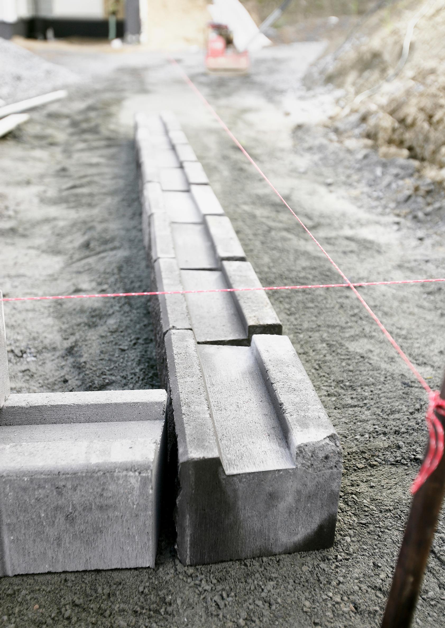 7. Porrastetun tukimuurin rakennus aloitetaan muurin alimmasta kohdasta. Alin taso rakennetaan ensimmäiseksi. Vaakatasoon tulevan muurin pohja puolestaan tasataan kokonaan kerralla.