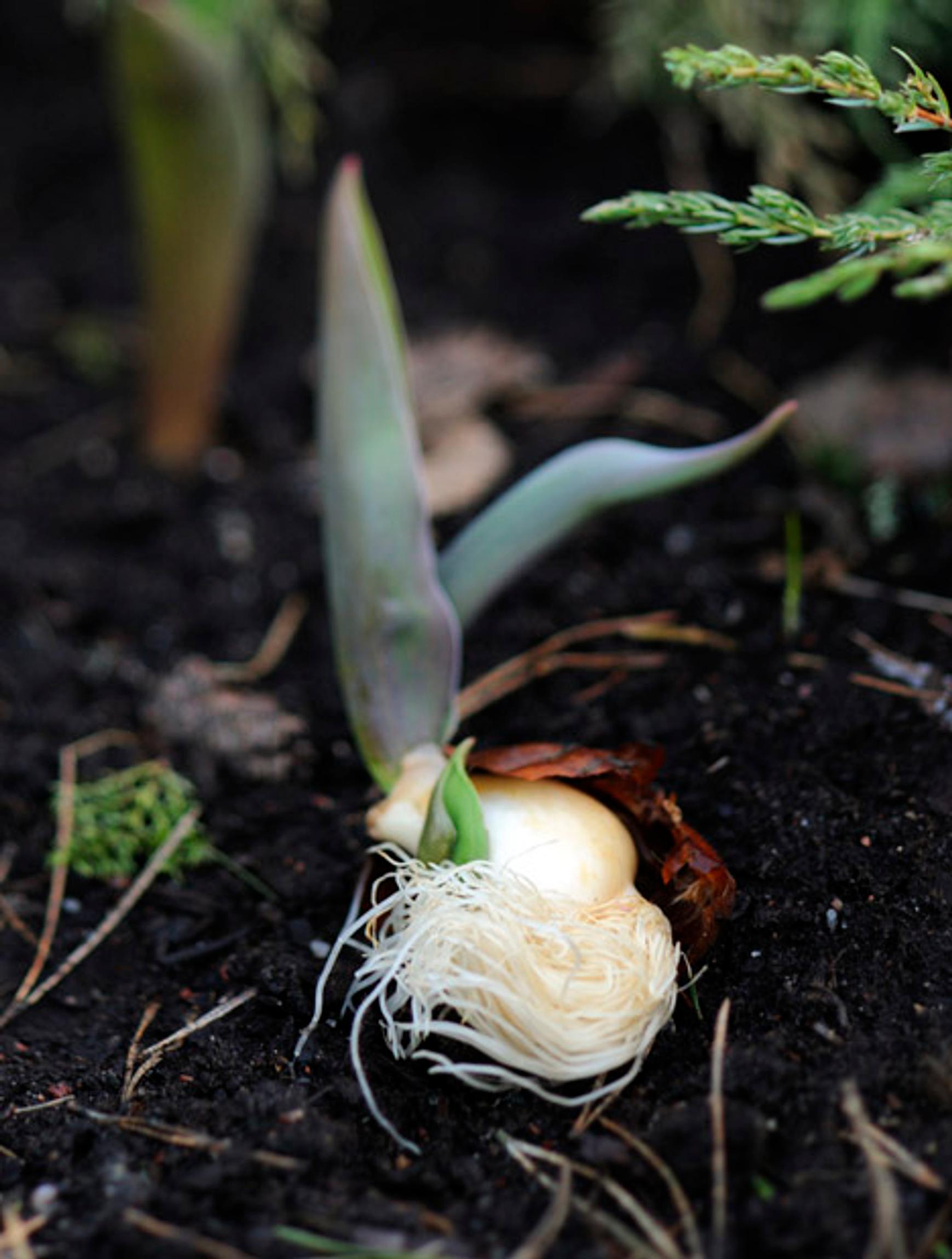 • Kaiva sopiva kuoppa istutuskuokalla tai käytä istutuskairaa. Aseta sipuli kuoppaan suippo pää ylöspäin ja juuret alaspäin. Peitä mullalla.