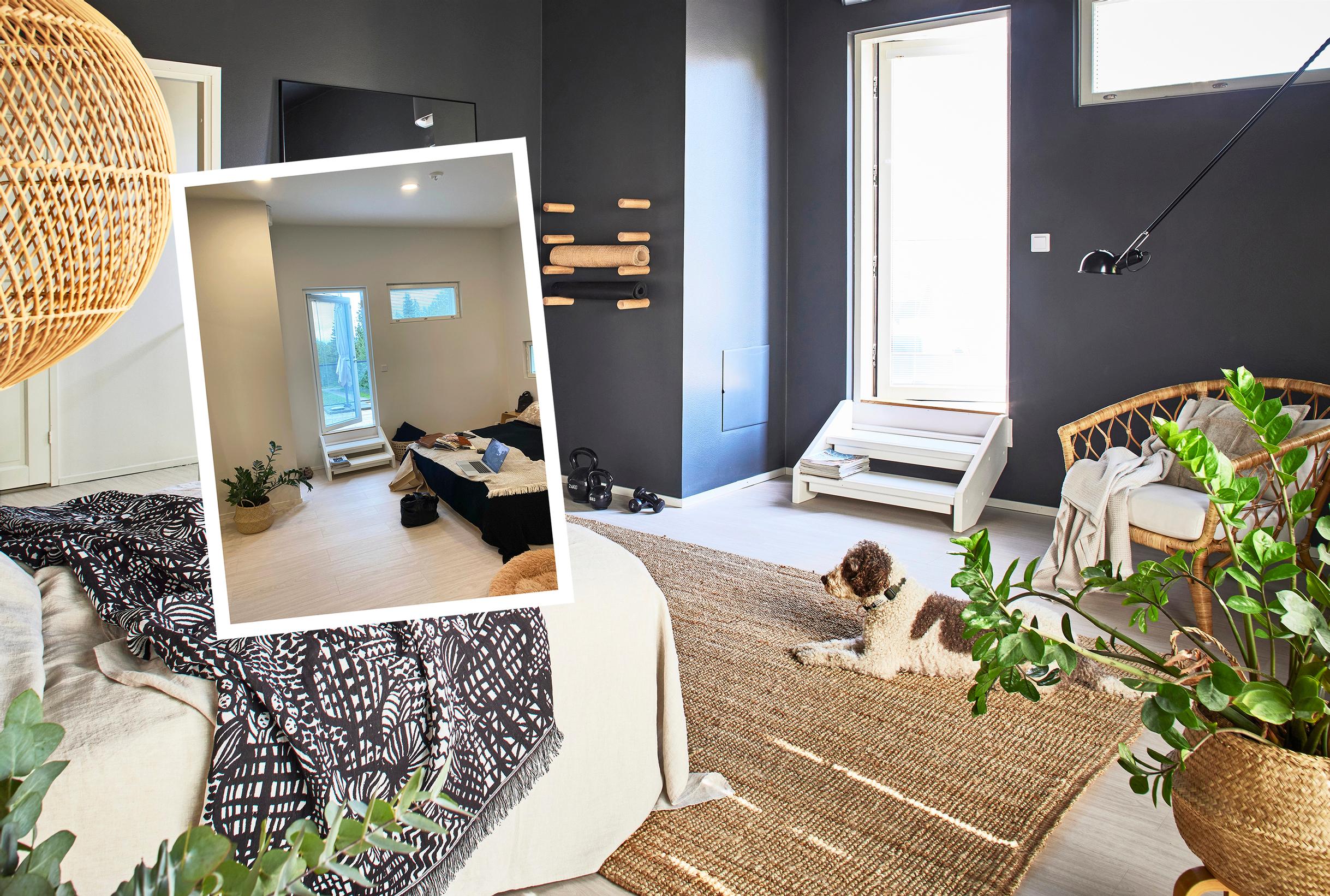 Sisustussuunnittelija yllätti grafiitinharmaalla katolla – ja mahdutti makuuhuoneeseen sängyn lisäksi jooganurkkauksen sekä lukusopen
