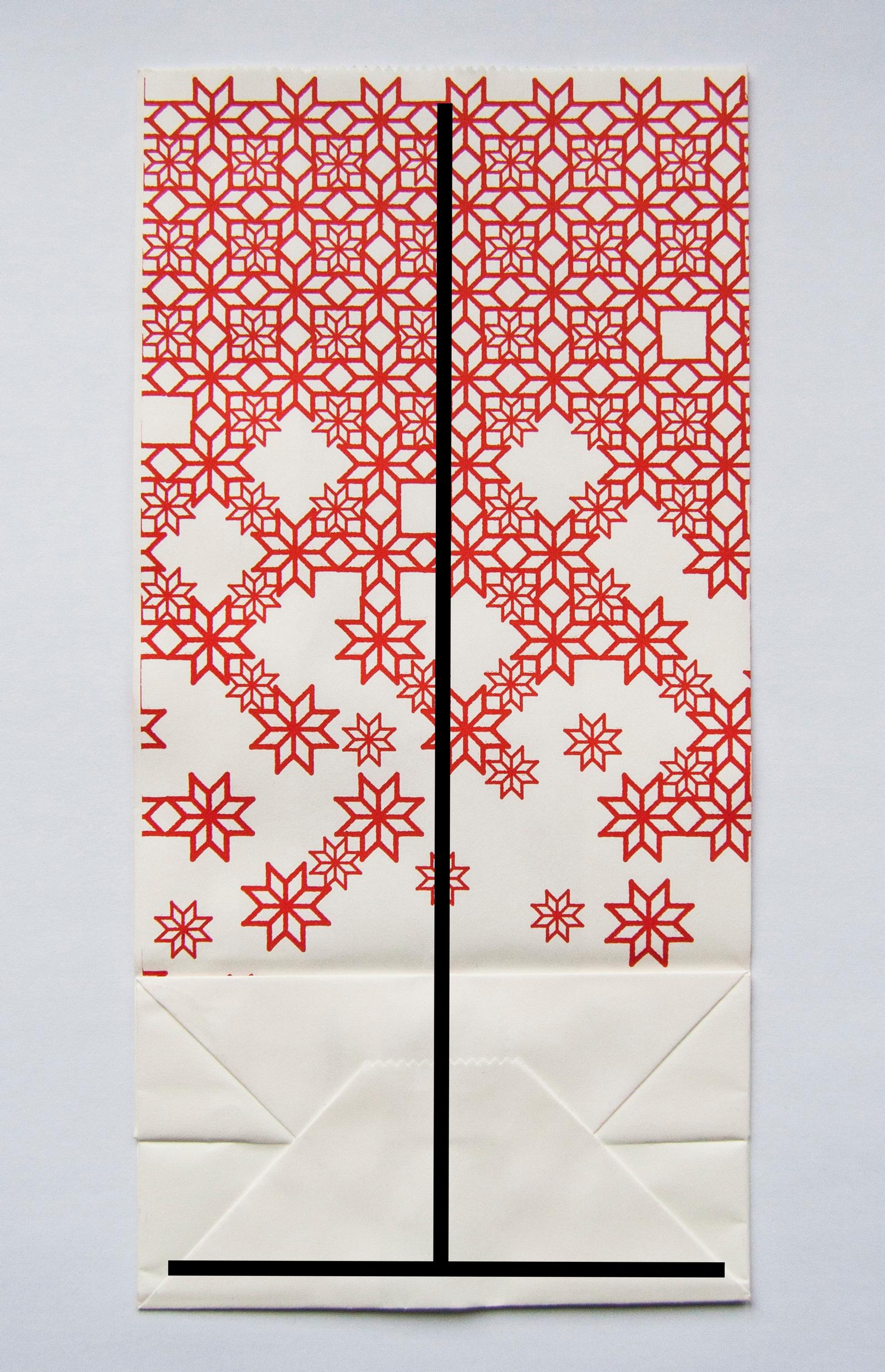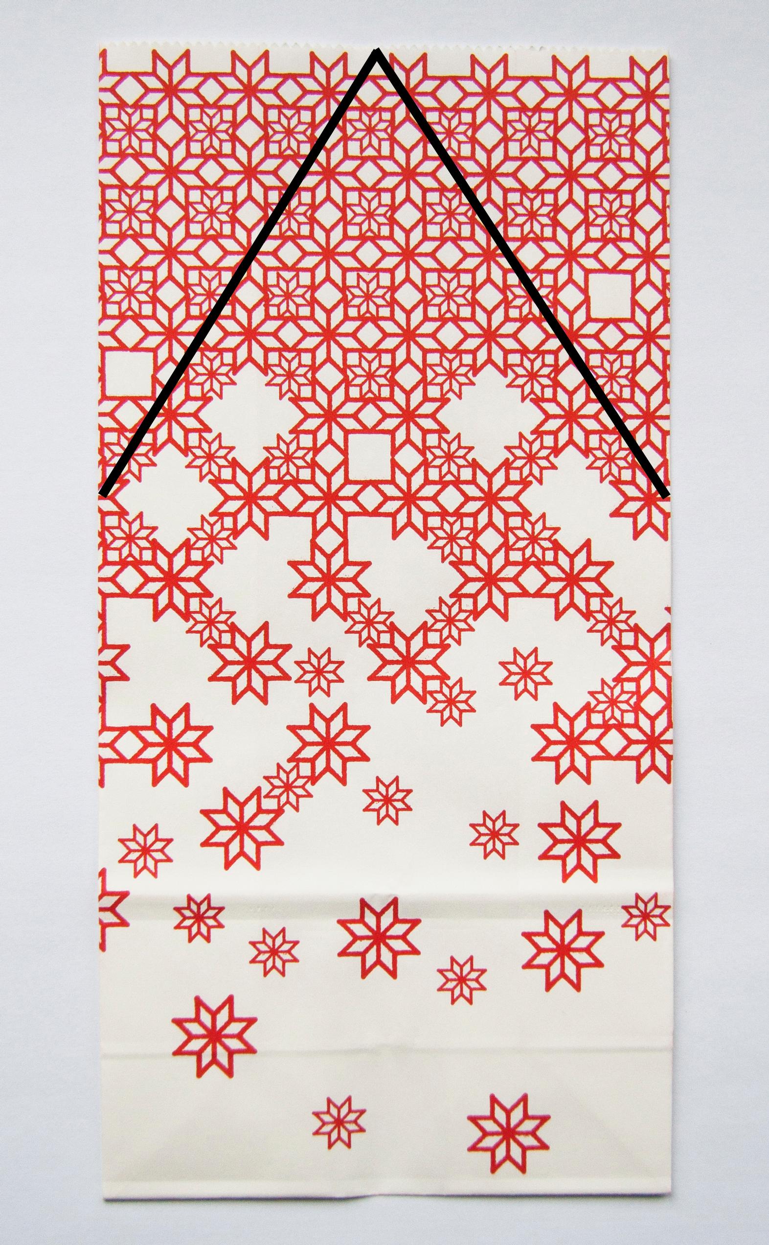 4. Leikkaa tähden sakarat vinottain kuvan mukaisesti. Jos käytät paksuja paperipusseja, et välttämättä saa leikattua kaikkia pusseja kerralla. Leikkaa tällöin pussit osissa muutama kerrallaan.