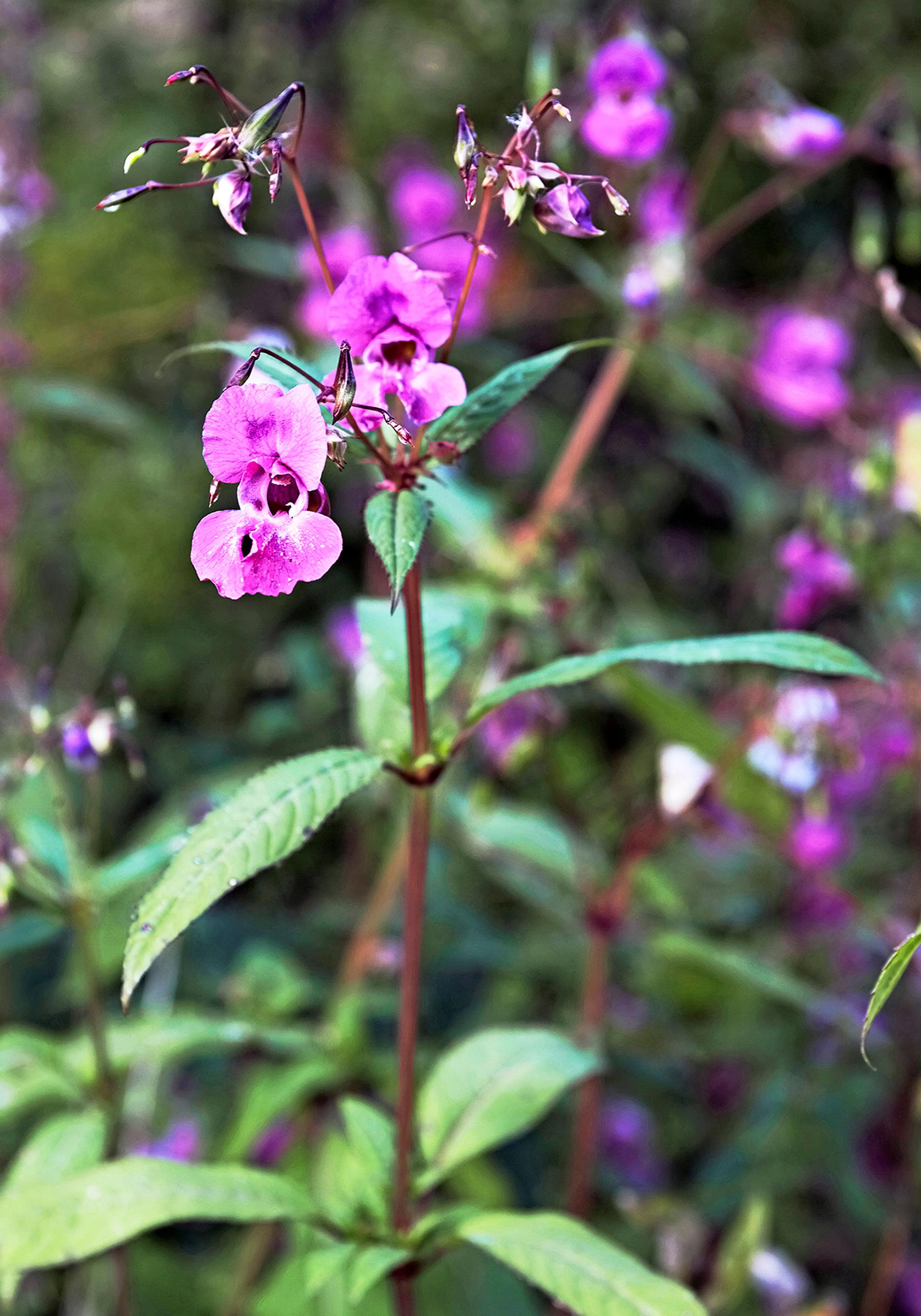 Tuntomerkit: Yksivuotinen, jopa 1,5-metriseksi kasvava laji. Valkoiset tai tumman- tai vaaleankarmiininpunaiset kukat tuottavat runsaasti siemeniä. Kukinta kesä–syyskuussa. Siemenet sinkoutuvat kodasta useiden metrien päähän. Sirkkataimessa kaksi isohkoa lehteä, joiden ruodit ja tyvet ovat viininpunaiset. Kasvustot usein vesistöjen rannoilla. Tavataan Rovaniemen pohjoispuolella saakka.