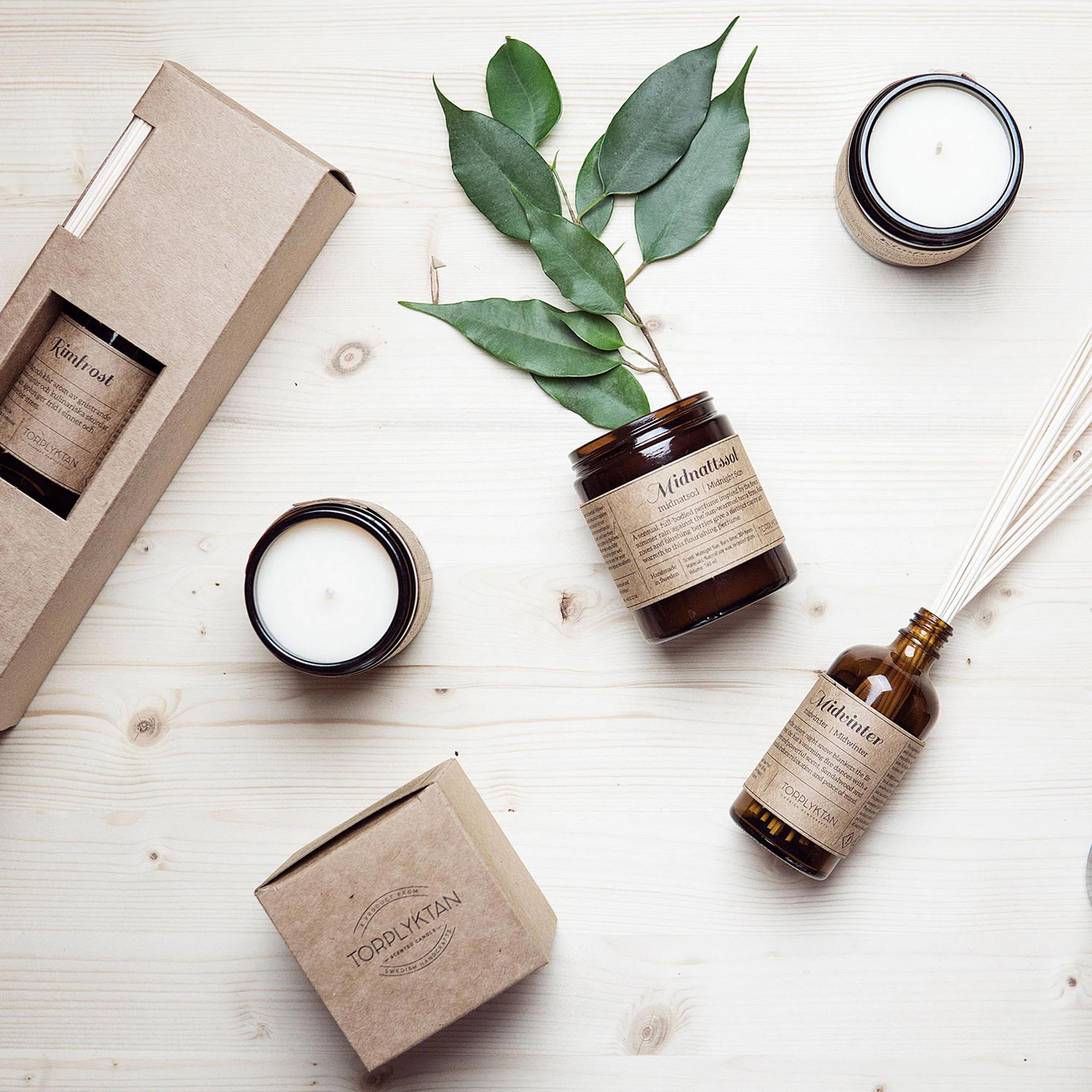 Keskitalvi-tuoksukynttilä vie sinut haavematkalle lumiseen metsään. Ruskea lasipurkki ja pahvietiketti ovat perinteisen tyylikkäät yhdessä.