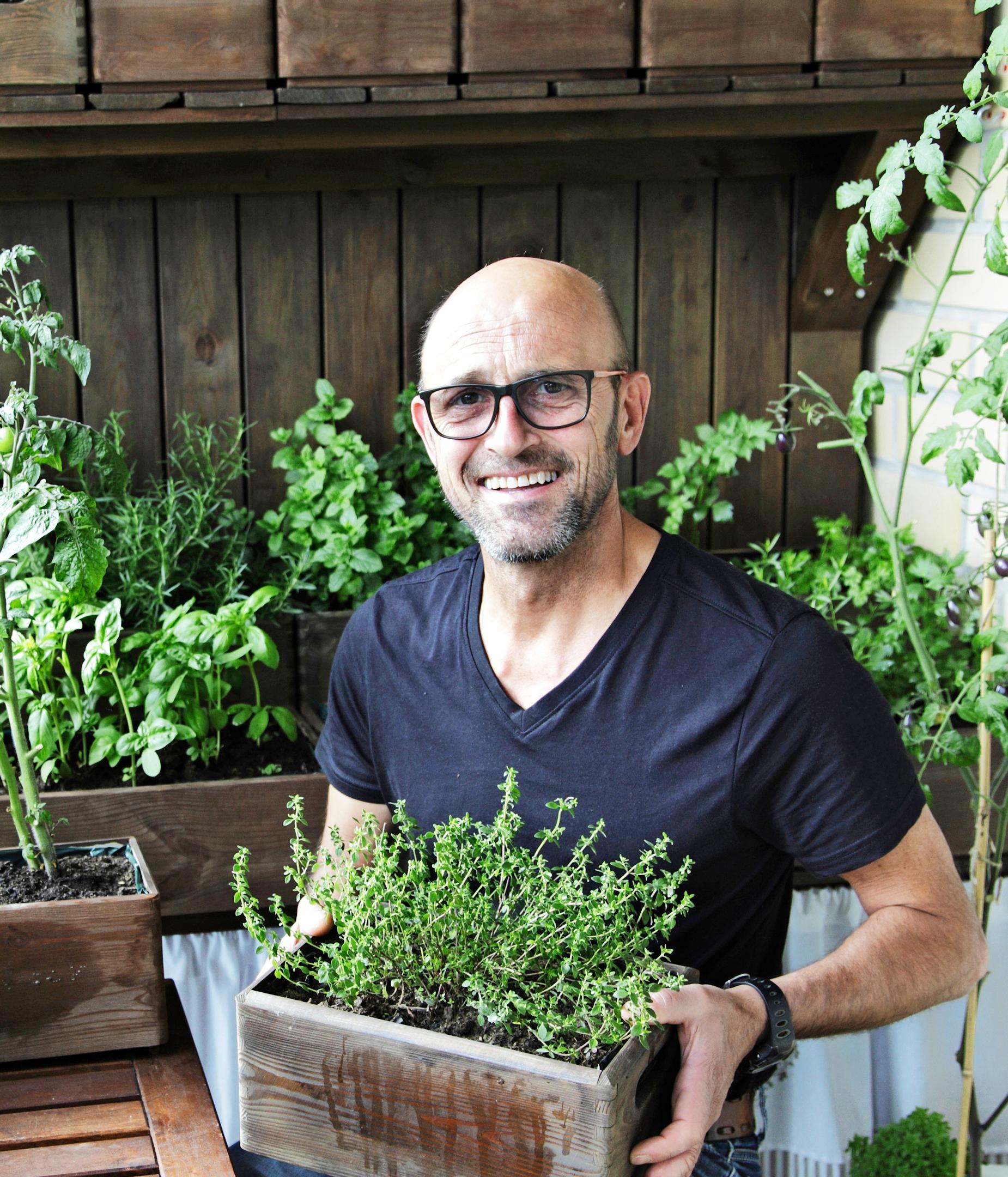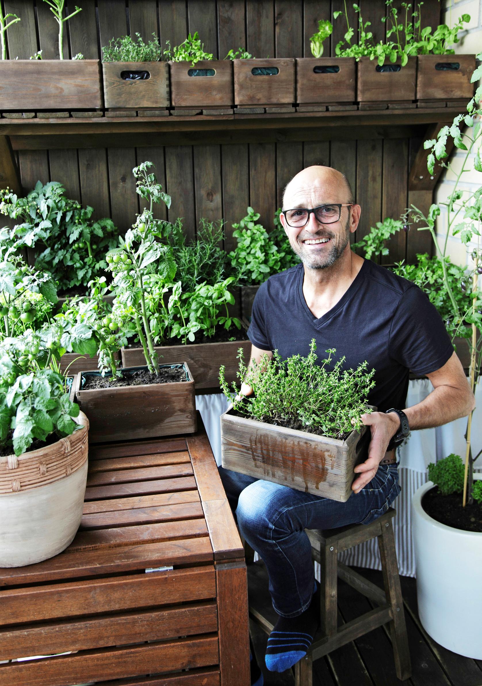 Kokki Elie Chanteloupin ja puoliso Hanna Kivikosken parvekkeella kasvaa vehreä keittiöpuutarha. Parveke on valjastettu seiniä myöten tuoksuvien yrttien, tomaattien ja muiden herkkujen käyttöön.