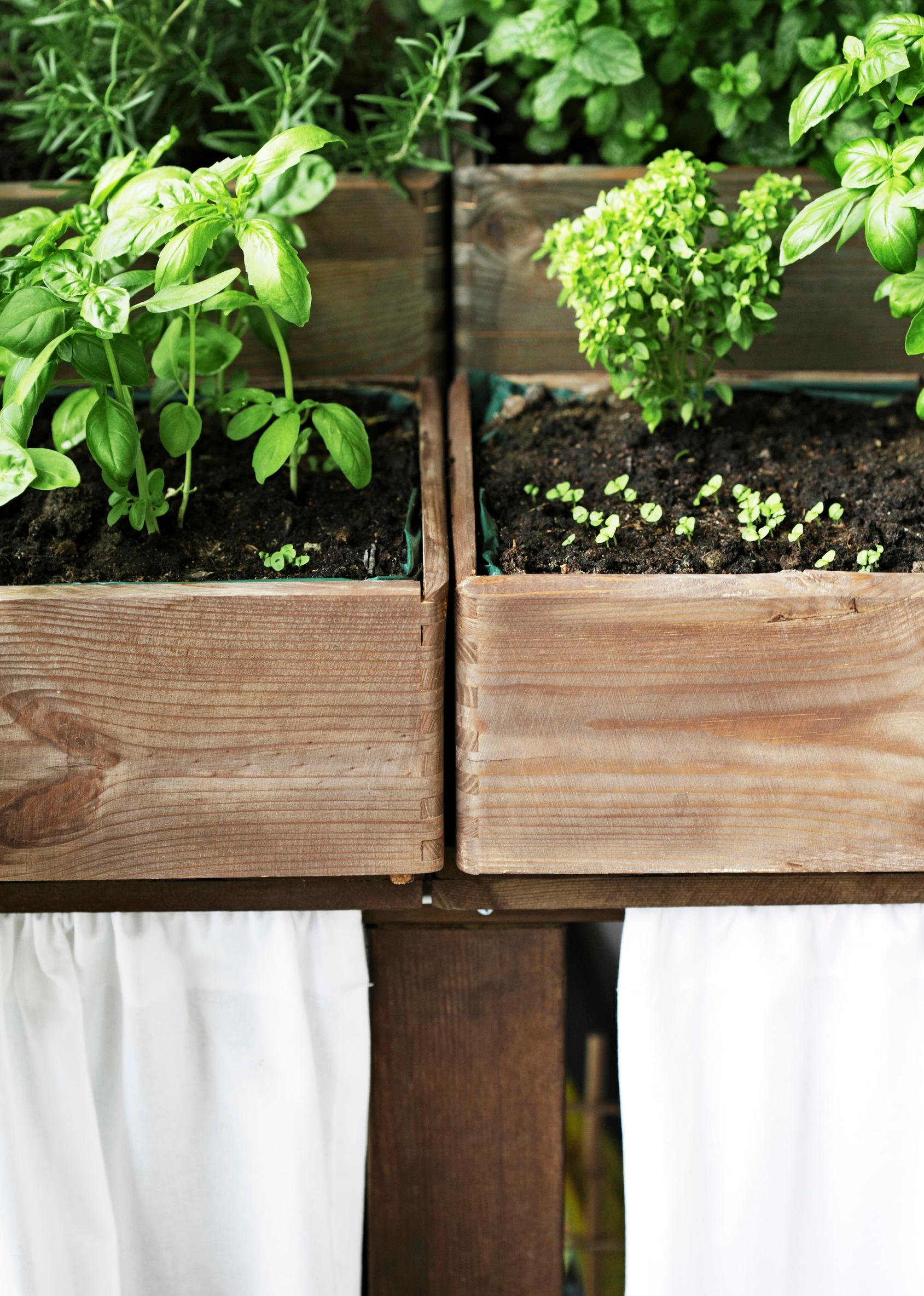 Rakennusmateriaalin Elie ja Hanna saivat edellisen asuntonsa terassilaudoista, jotka he hioivat ennen uutta käyttöä. Kasvulaatikoina on erikokoisia puulaatikoita. Niistä syntyy seinälle kiva porrastus, ja näin osa kasveista saa tarvitsemansa syvän multatilan.