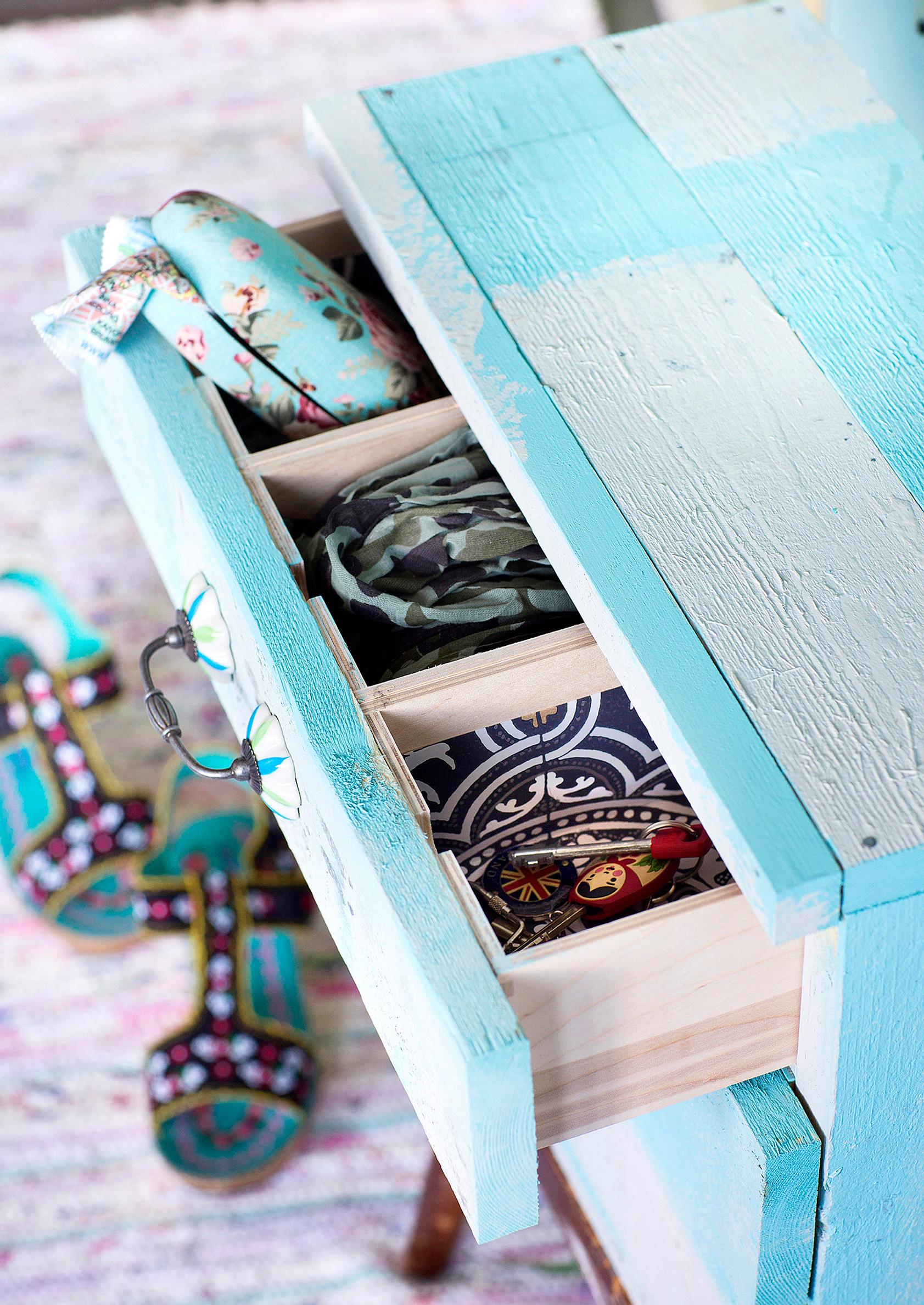 Ikean minilaatikosto Moppe on monelle tuttu jo vuosien takaa. Edelleen tuotannossa olevaa säilytyslaatikostoa on useita kokoja. Tuunasimme 42 x 18 x 32 -senttisestä Mopesta pienen eteiskalusteen laudanpätkillä ja vetimillä. Vanhasta jakkarasta tuli jalat.