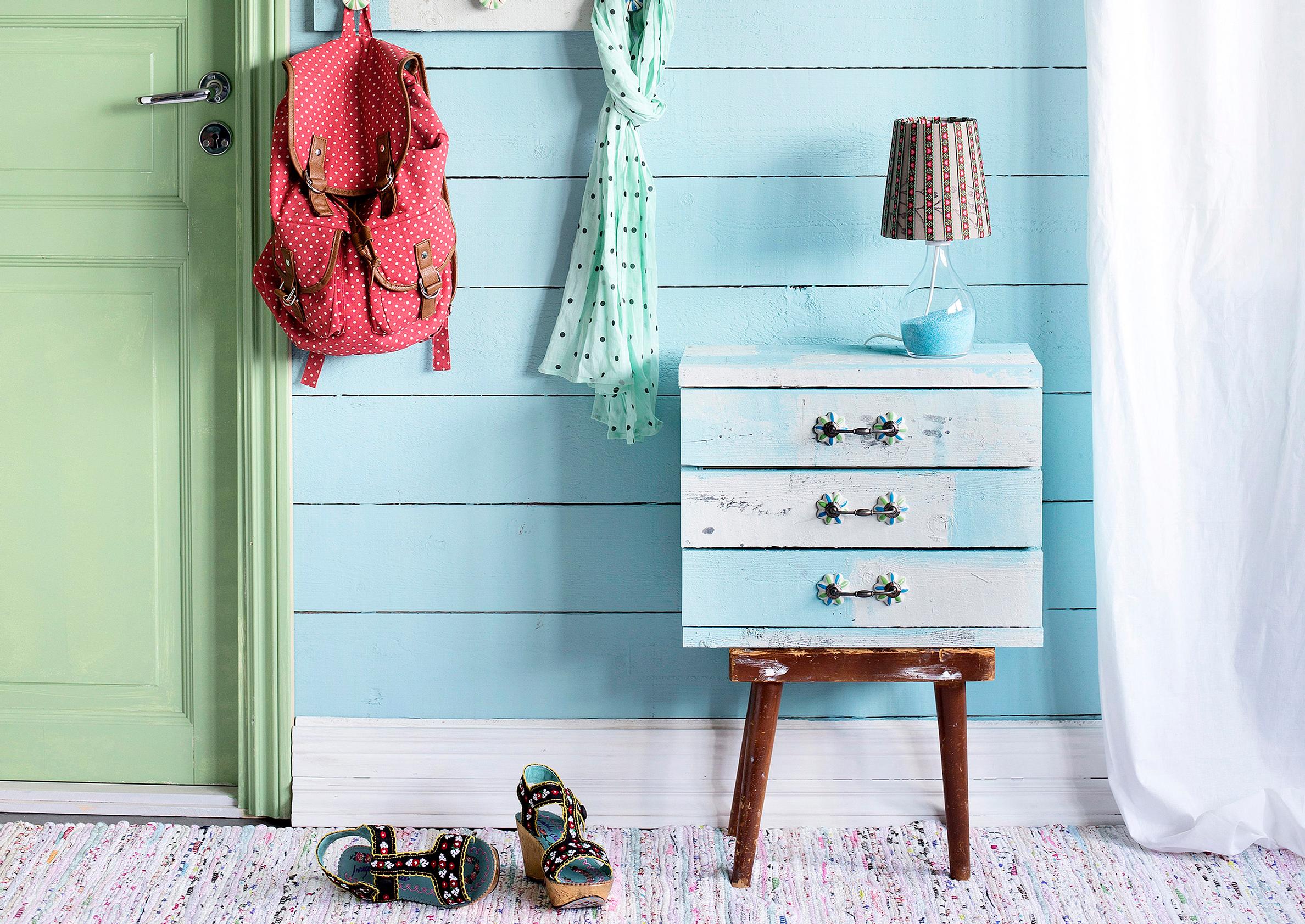 Tuunaa vanerisesta laatikostosta laudanpätkillä ja vetimillä näppärä eteiskaluste. Samanhenkinen naulakko syntyy laudasta ja nupeista, ja varjostin saa uuden ilmeen koristenauhalla.