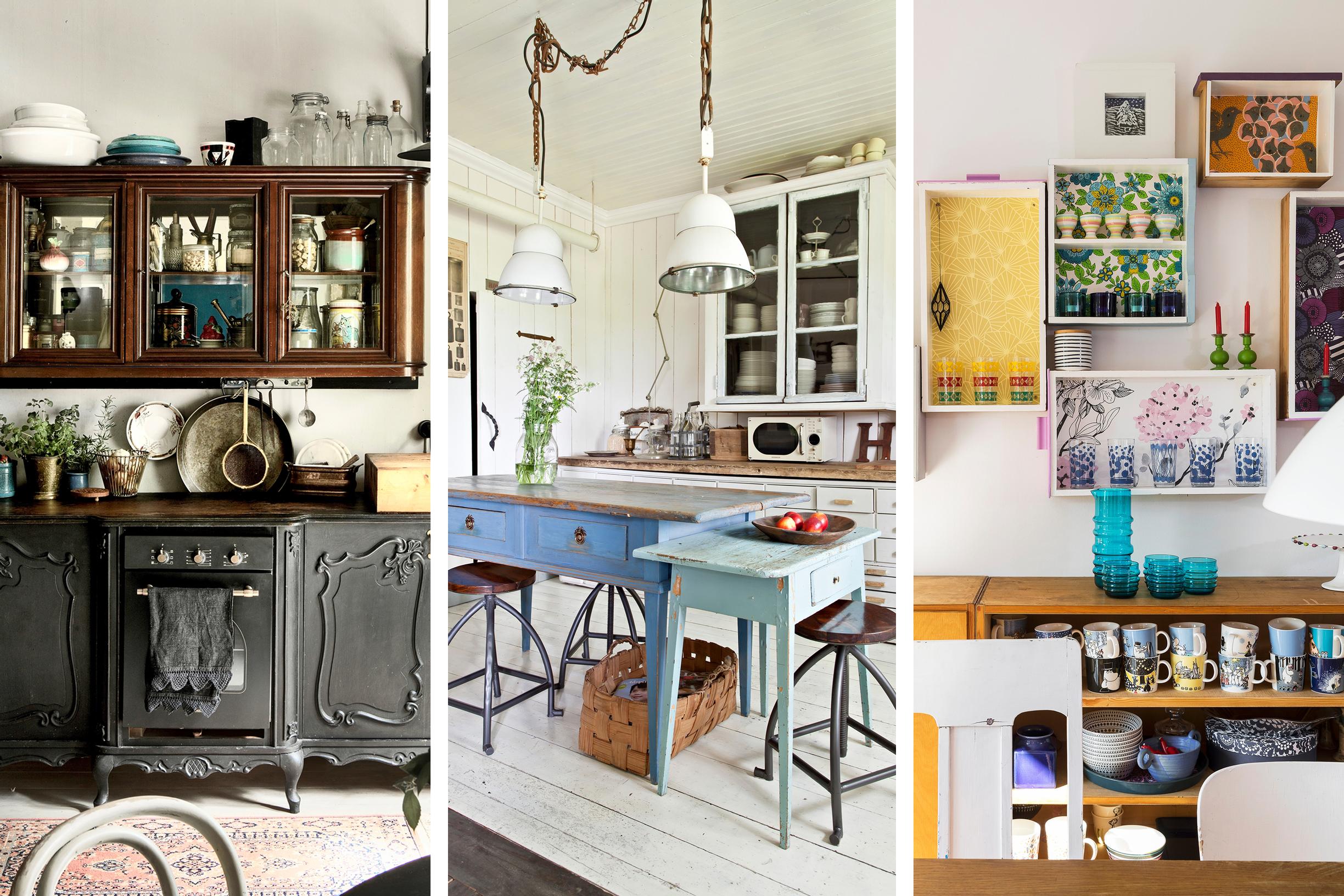 Joskus peruskeittiö ei vain riitä. Silloin voit jatkaa kaapistoa kankaalla, tehdä saarekkeen antiikkipöydästä tai seinähyllyt laatikoista. Kokosimme ideat!