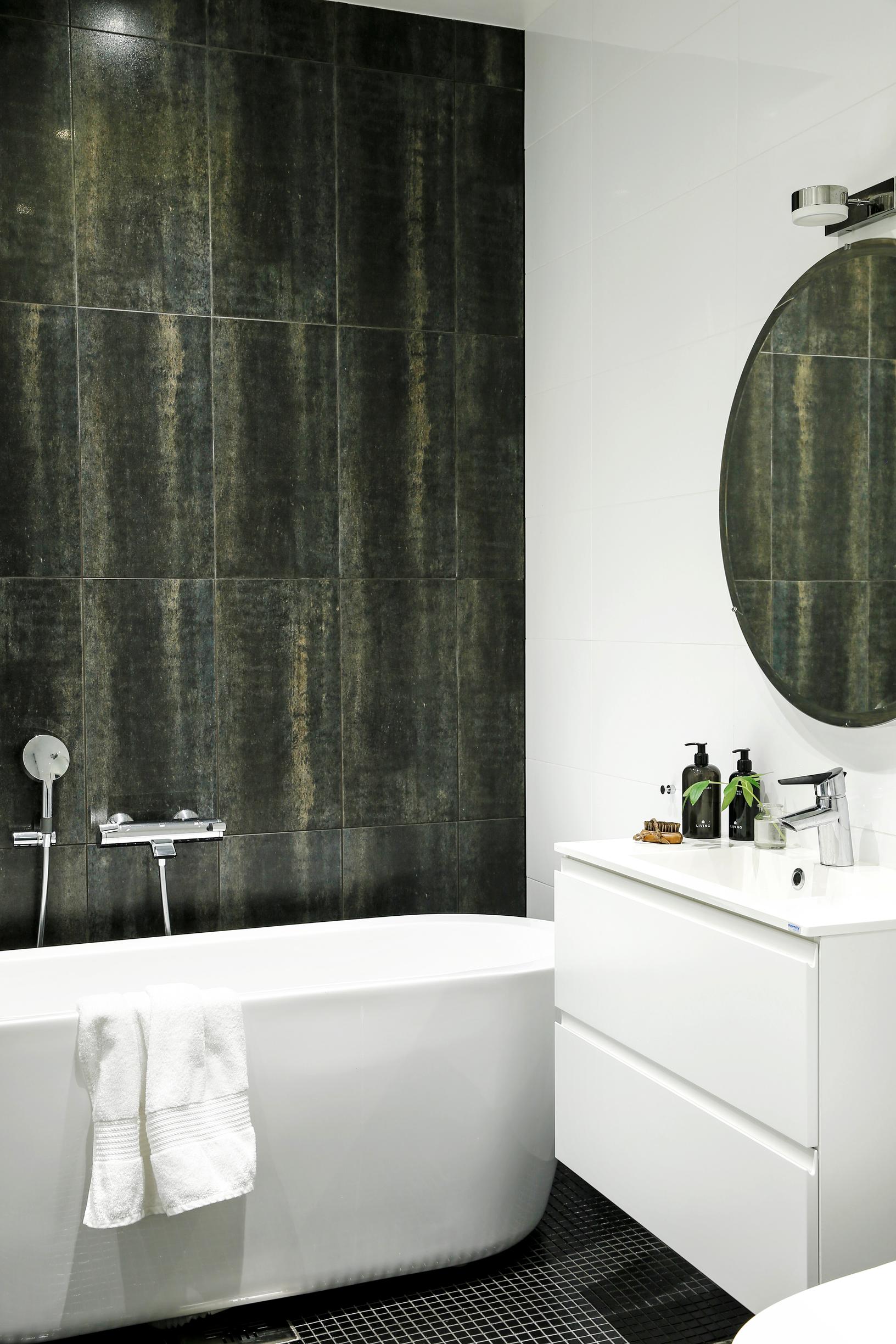 Ylellisessä kylpyhuoneessa sijaitsee myös kodinhoitopiste, jossa on kuivaava pesukone ja integroitu pyykkikori. Tilassa on ammeen lisäsi erillinen suihku. Lattian tummat mosaiikkilaatat ovat osoittautuneet käytössä erittäin armollisiksi.