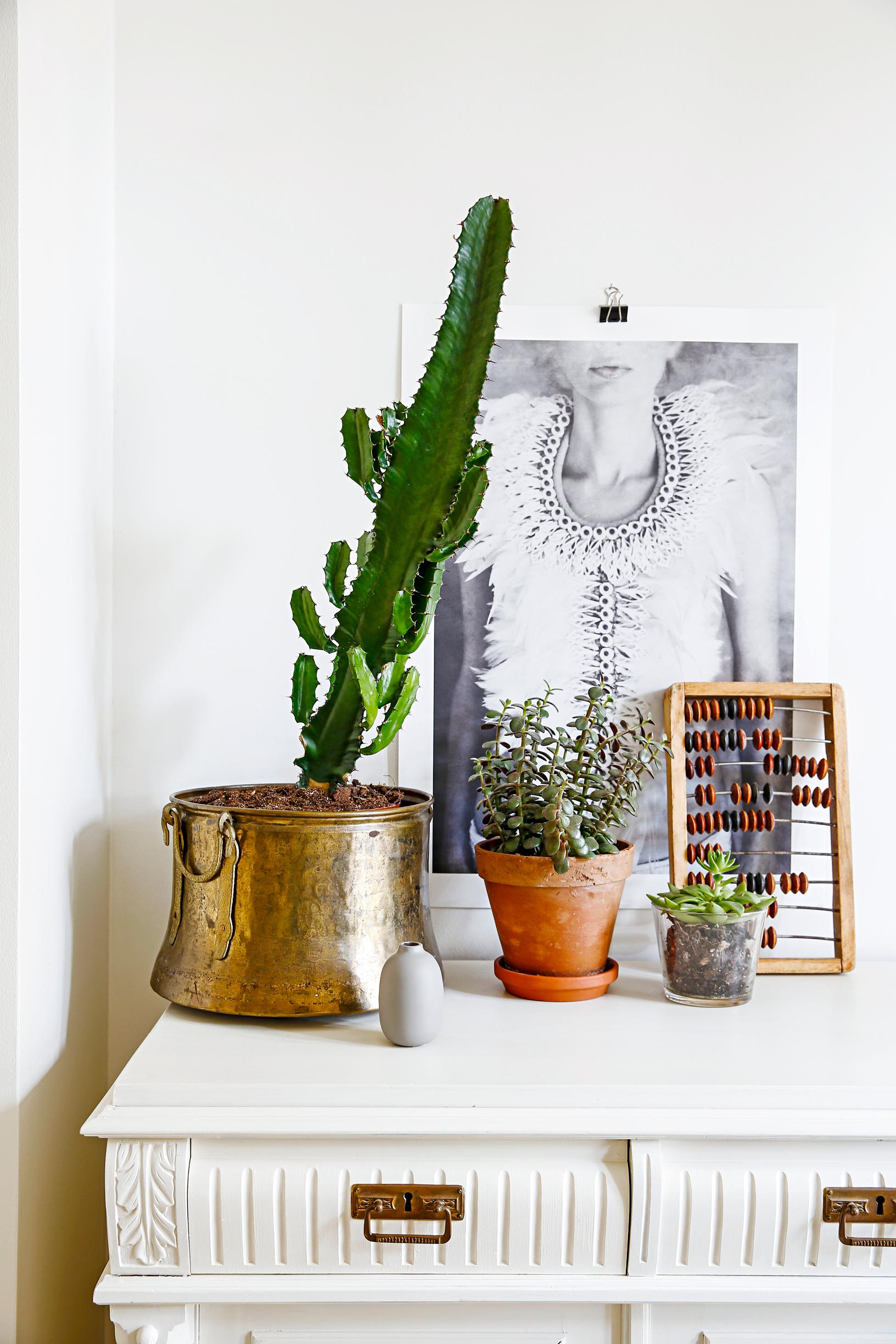 Kauniita asetelmia on kodissa siellä täällä. Sopusuhtainen sommitelma onnistuu, kun esineet ovat erimuotoisia ja -kokoisia. Lipasto on Fasaanista ja juliste ruotsalaisen valokuvaajan Tove Frankin.