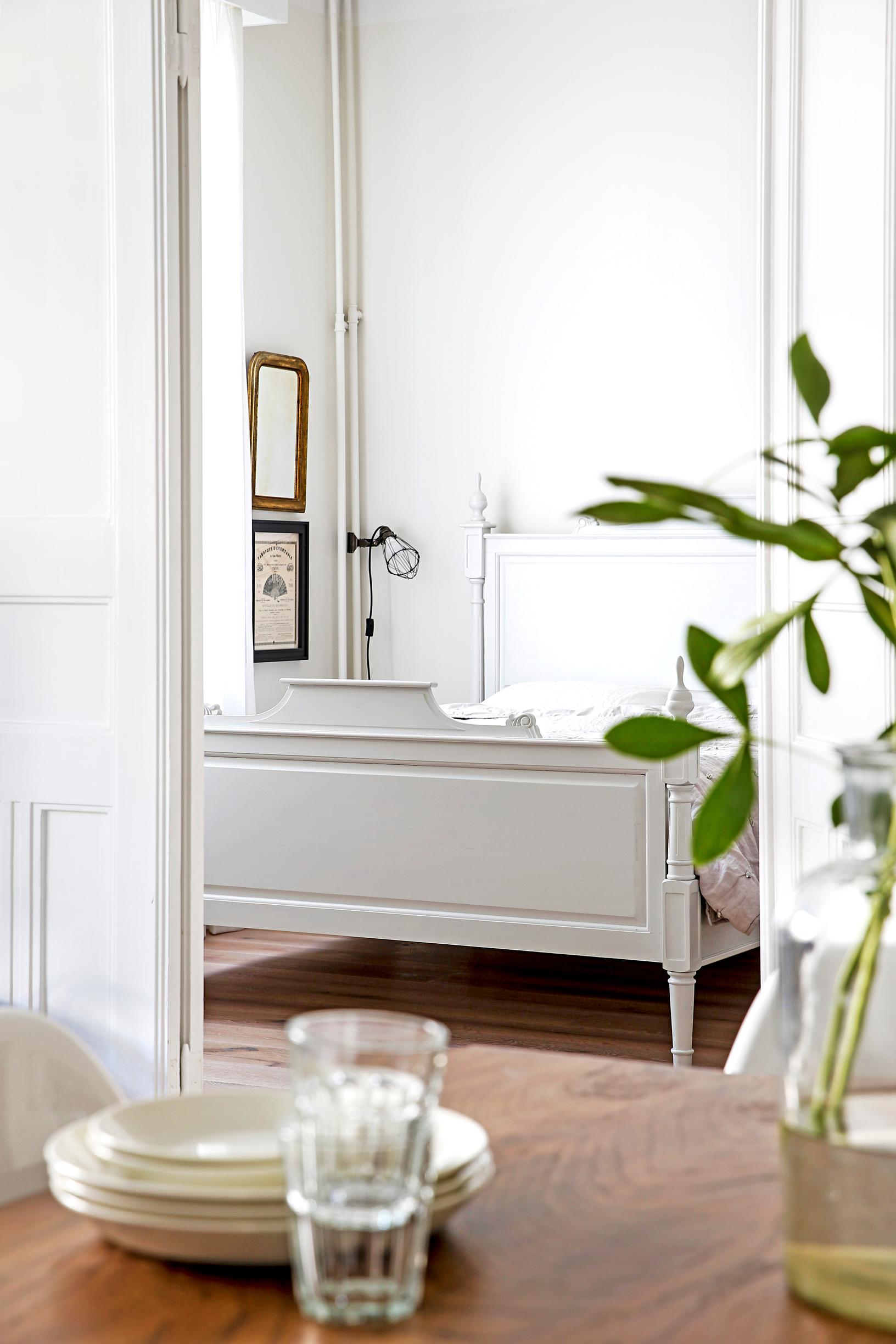 Vanhempien makuuhuoneen suuret taiteovet avautuvat olohuoneeseen ja ovat lähes aina auki. Juvin kustavilainen Eleonoora-puusänky on kaunis petaamattomanakin.