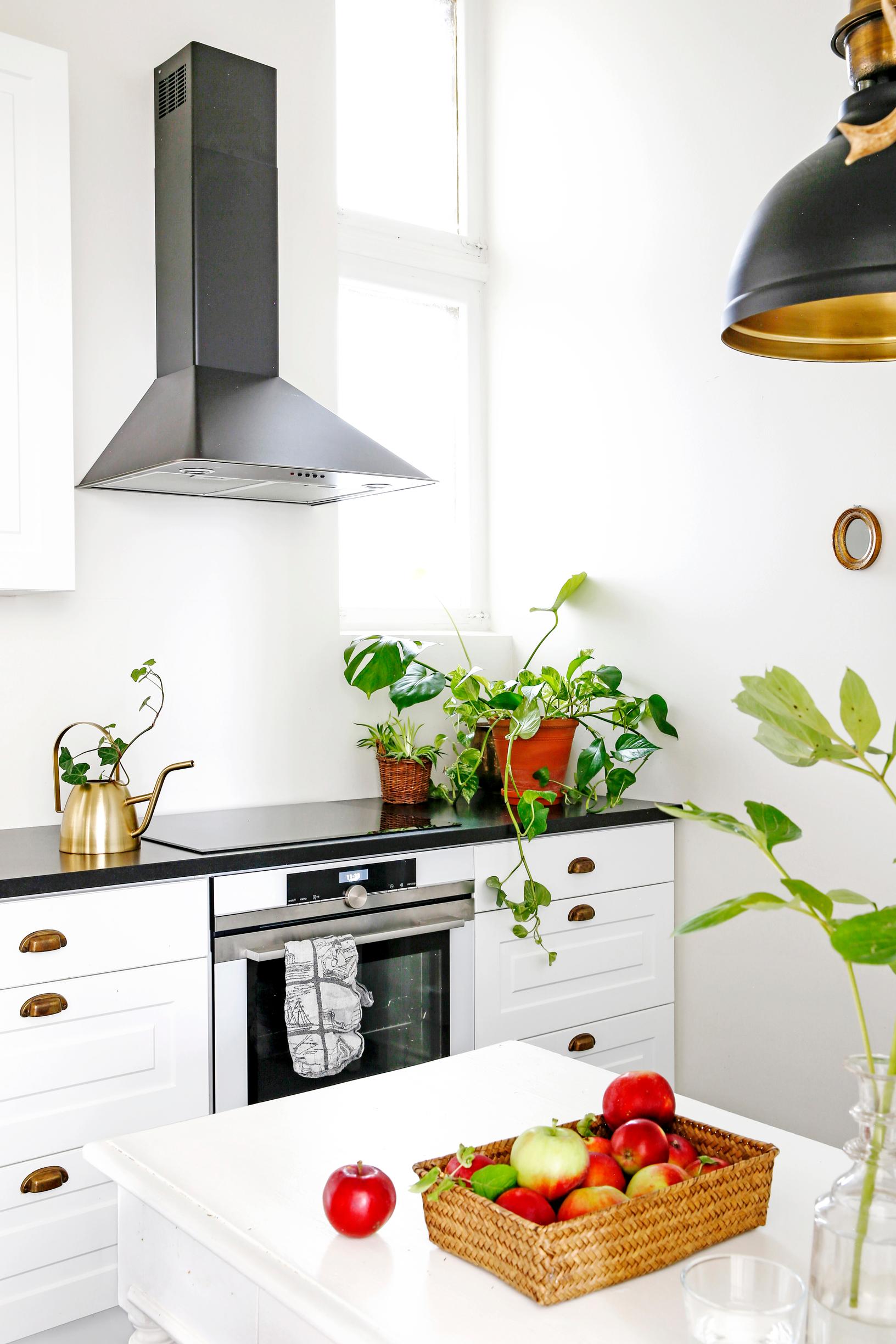 Marja keksi viimeistellä valkoiset keittiönovet messinkisillä Juvin nupeilla ja vetimillä, jotka tuovat tarvittavaa rosoa mustavalkoiseen keittiöön. Kaapistot ovat Ideal-keittiön.