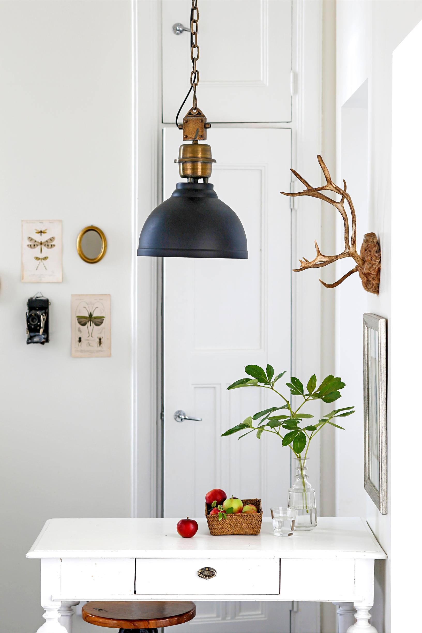 Vanha tammikaappi on löytö Lahden antiikkitukusta. Vanha maalipinta poistettiin ja esille hiottiin kaunis puupinta. Pulpetti on vanhan koulun irtaimistoa. Sen kannen alle Linnea ja Leo säilövät pieniä aarteita, ja vieretysten on mukava puuhailla. Marja vahasi pulpetin tummaksi Osmo Colorin antiikkitammensävyisellä vahalla. Pinta vain paranee käytön myötä.