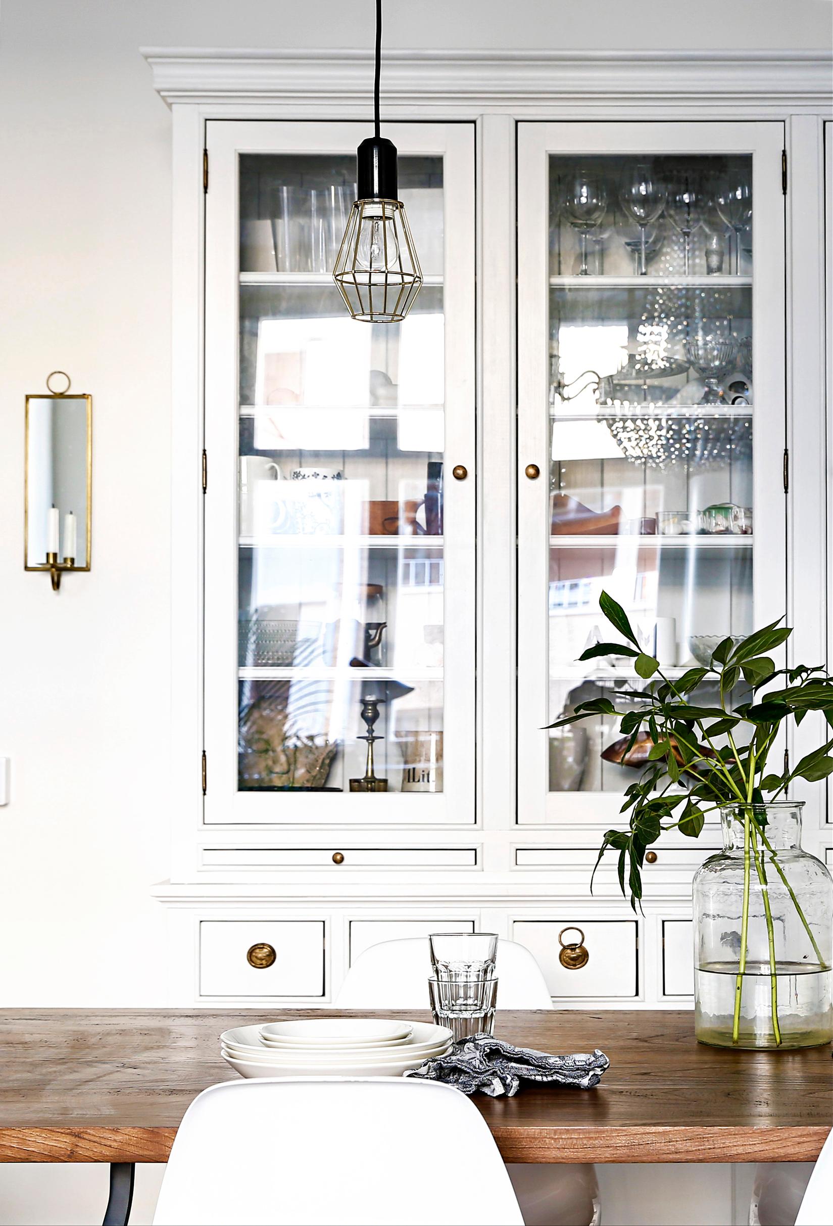 Olohuoneen päädyssä on tilaa suurelle ruokapöydälle ja Juvin Firenze-astia kaapille. Kaikki kodin seinät on maalattu Tikkurilan Damasti F485 -sävyllä.