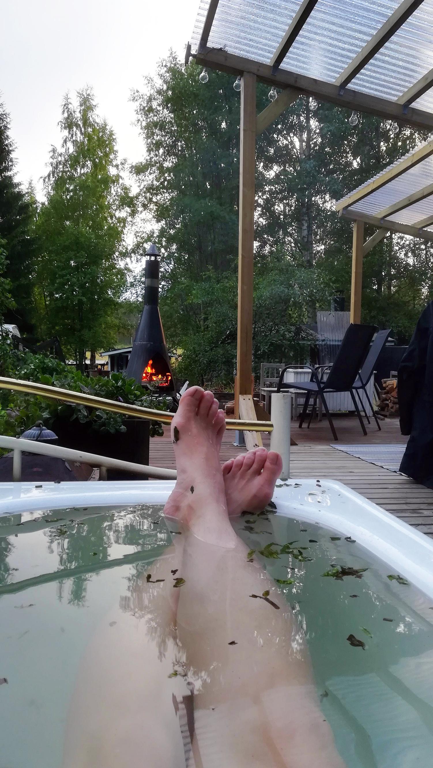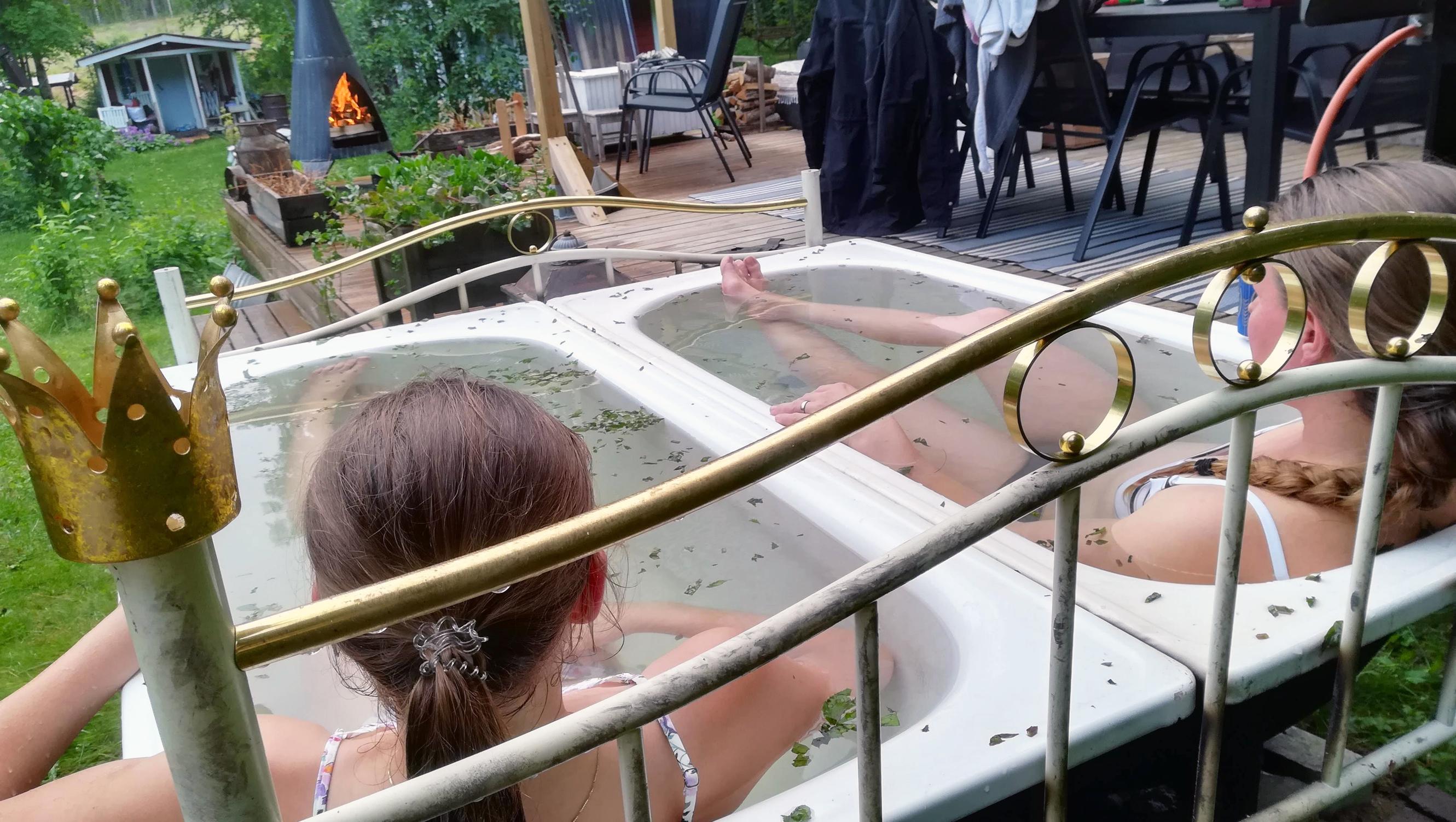 Tämän kesän helteillä olemme säästelleet vettä, ja jättäneet kylpemiset väliin. Aiemmin olemme kylpeneet lähes joka kerta, kun olemme olleet kakkoskodissamme. Itse tykkään ennemmin loikoilla lämpöisessä vedessä ja katsella taivaalle kuin mennä saunaan!