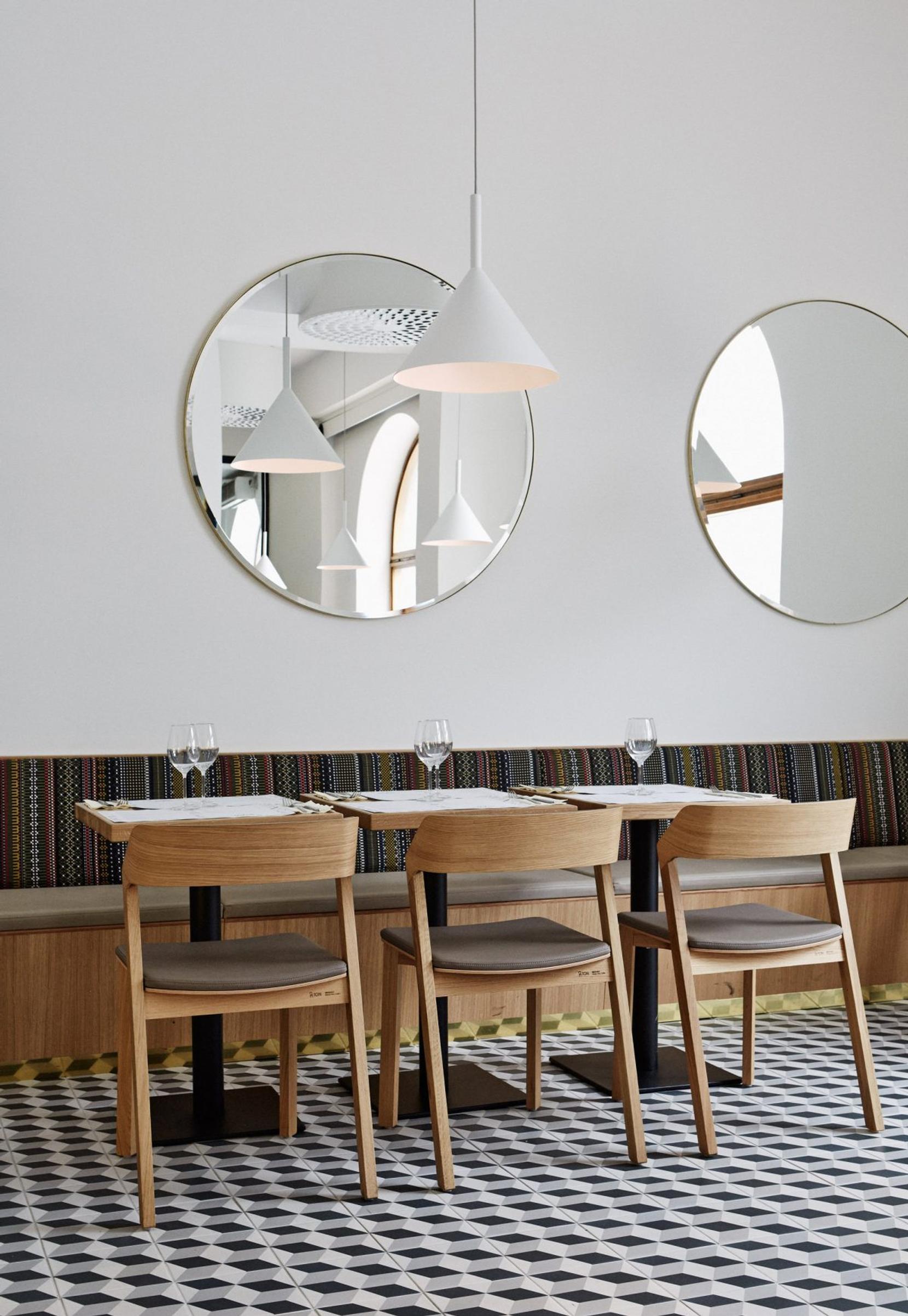 Peilin voi kiinnittää seinälle kohtisuoraan tai näyttämään hieman alaviistoon, jolloin kuvajainen muuttuu. Kiinnitä siis huomiota, mitä peilistä heijastuu. Parhaimmillaan peili on paljon moniulotteisempi ja rauhallisempi elementti kuin taulu. Varsinkin pienen tilan seinälle asennettu peili voi tehdä ihmeitä, ja tila voi tuntua jatkuvan lähes äärettömiin. Joanna Laajiston suunnittelema Intro-ravintola-baari Kuopiossa on ehdottomasti visiitin arvoinen. Kuva Mikko Ryhänen.