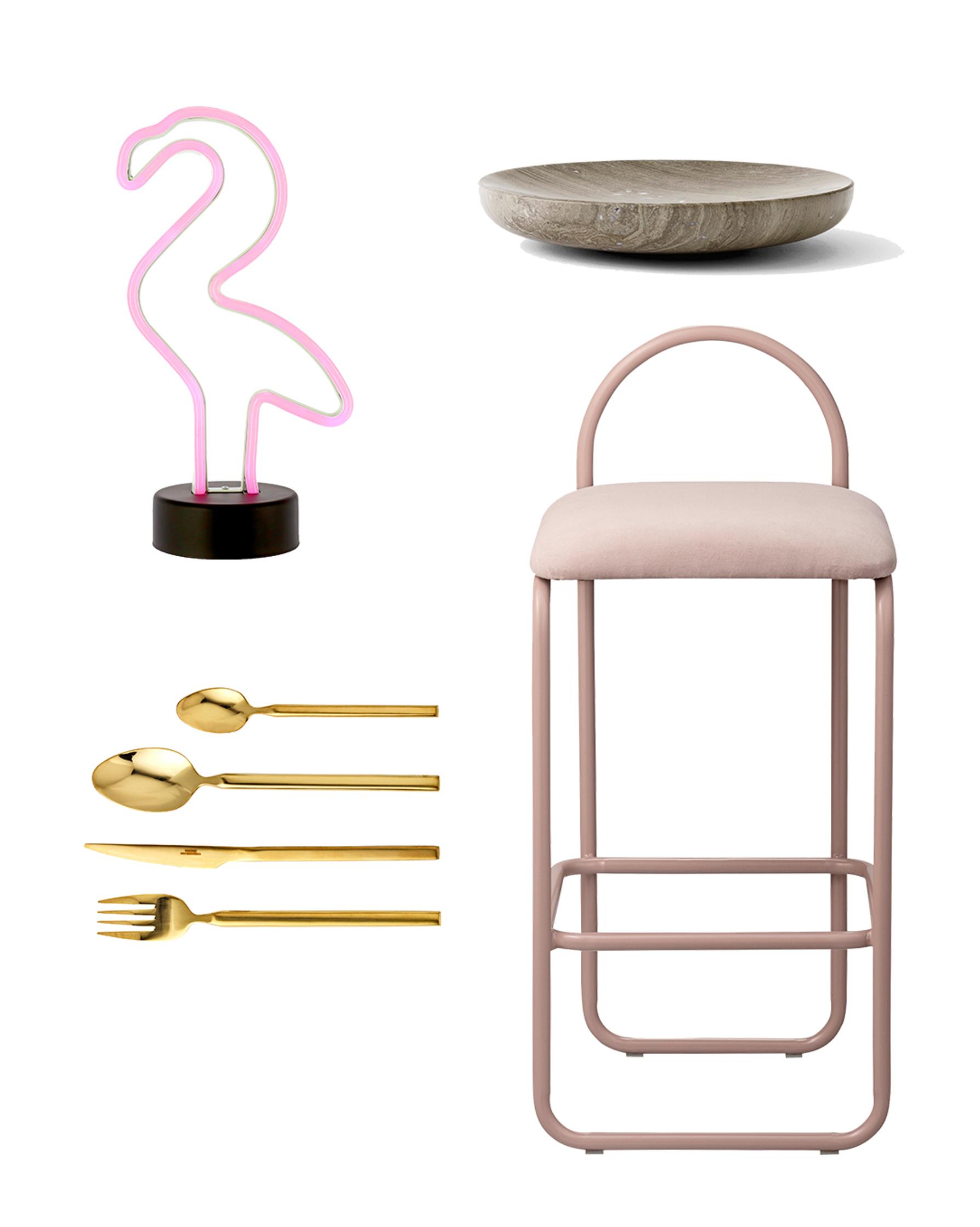 Leikkisä Clas Ohlsonin Flamingo-koristevalaisin on paristokäyttöinen. Ylellisessä Broste Copenhagenin Tvis-aterinsetissä on 16 osaa. Menun marmorinen Hover-vati on kaunis myös tyhjillään. Aytmin Angui Chair -pikkutuoli on verhoiltu puuvillasametilla.