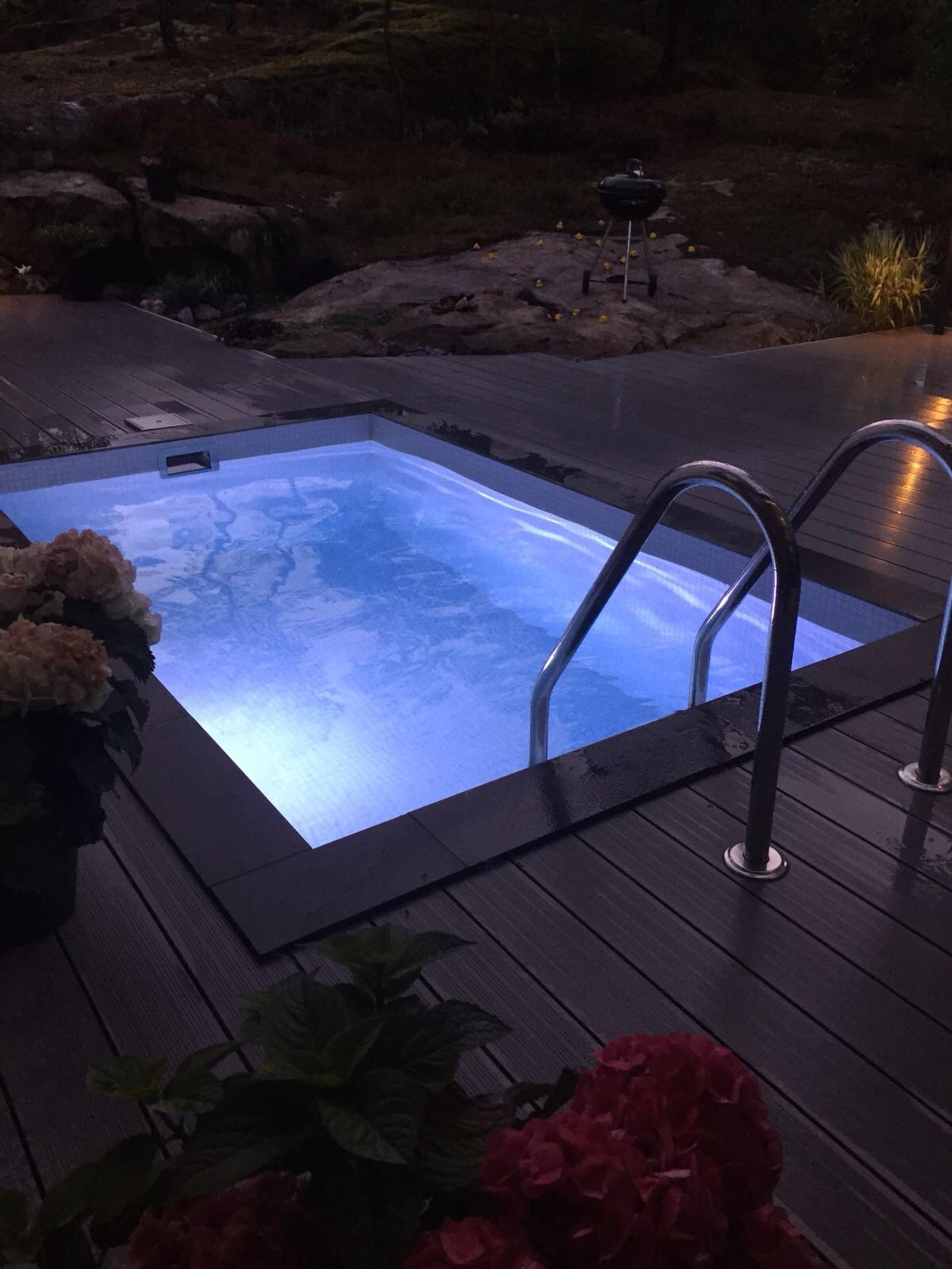 Syksyn pimeinä iltoina valaistu allas luo kivaa tunnelmaa. Parasta on pulahtaa pimeänä syysiltana saunasta jääkylmään veteen ja kipaista siitä takaisin löylyyn.