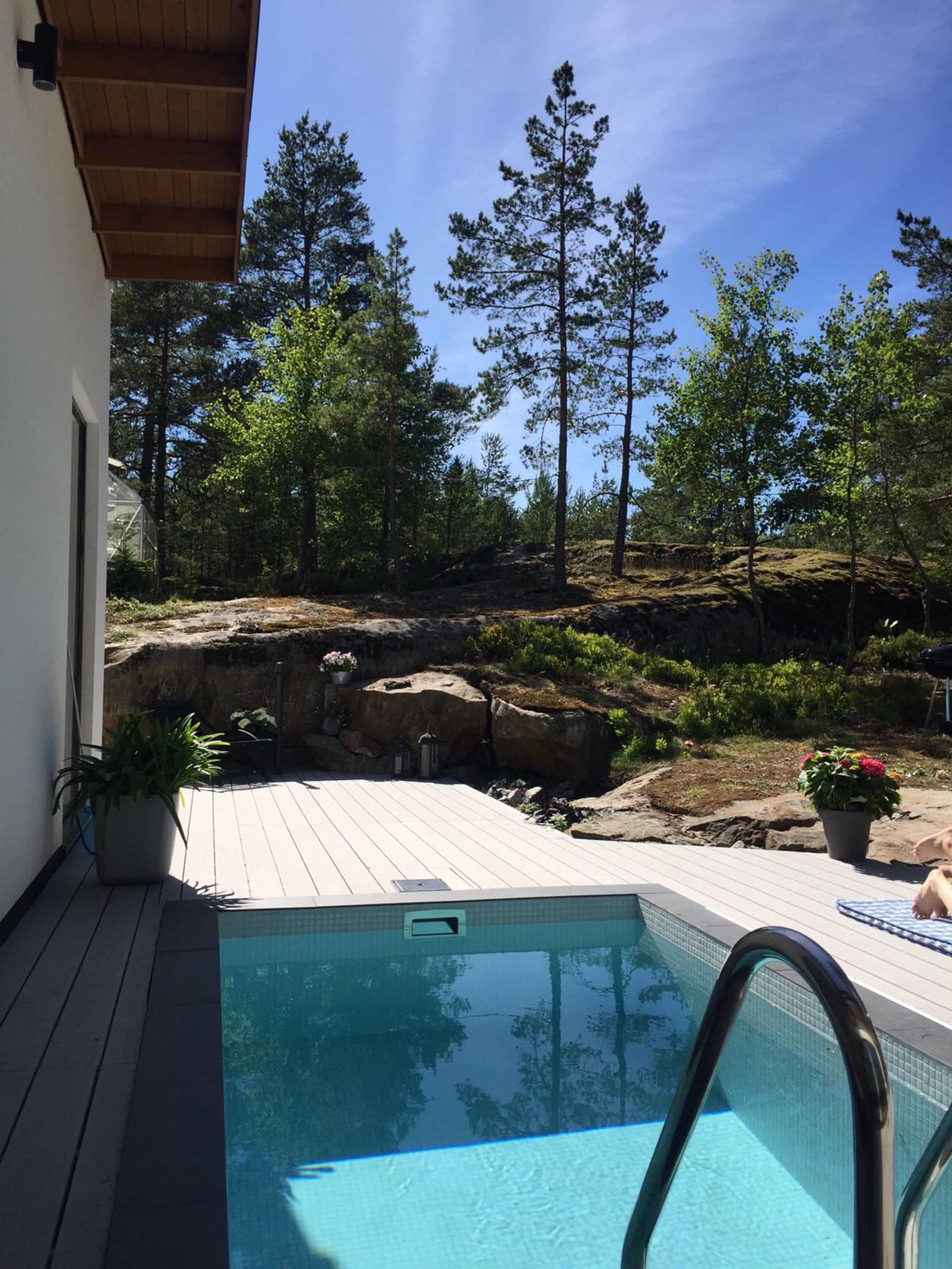 Itse allas ei ollut kallis, portaineen noin 2000 euroa. Päälle tulivat kuitenkin pohja- ja maatyöt, asentaminen sekä lämmitin. Samalla rakensimme noin sadan neliömetrin terassin. Kaikkiaan hintaa tuli 12 000 euroa.
