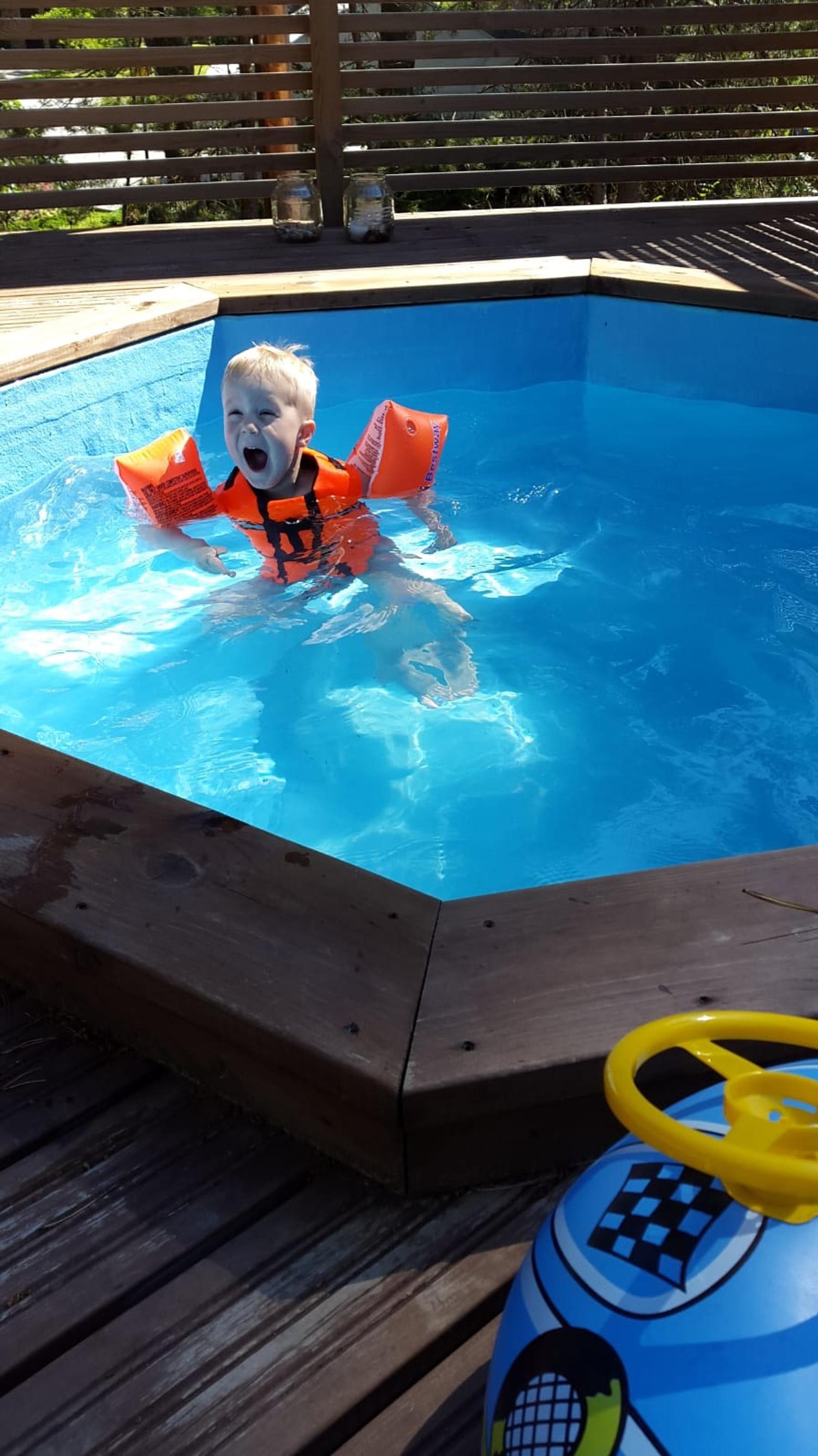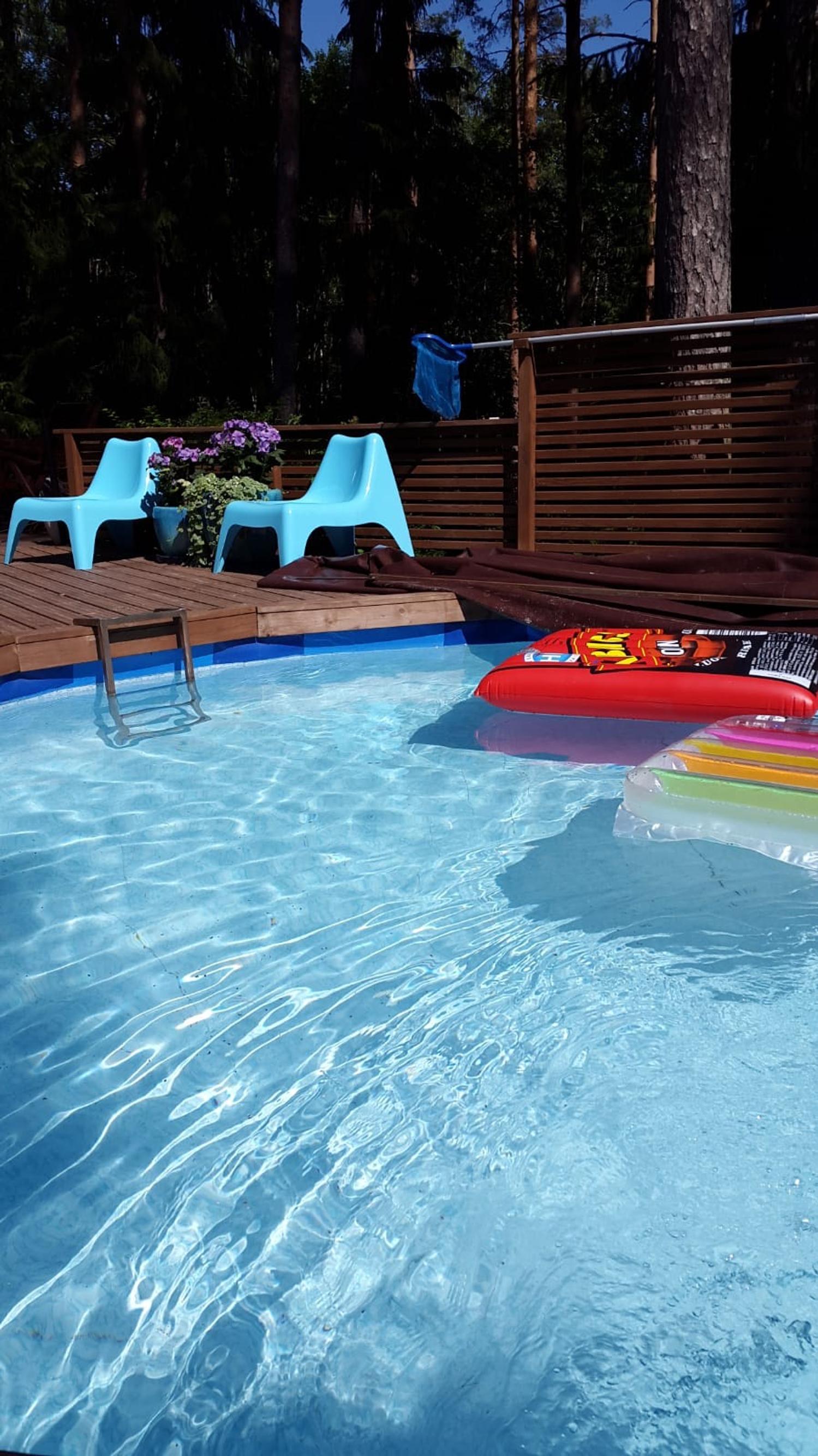 Ostimme ensimmäisen uima-altaamme käytettynä toistakymmentä vuotta sitten. Se oli paljon pienempi kuin tämä nykyinen. Muutama vuosi sitten innostuimme hankkimaan uuden, jotta myös me aikuisetkin voisimme uida kotipihassamme.