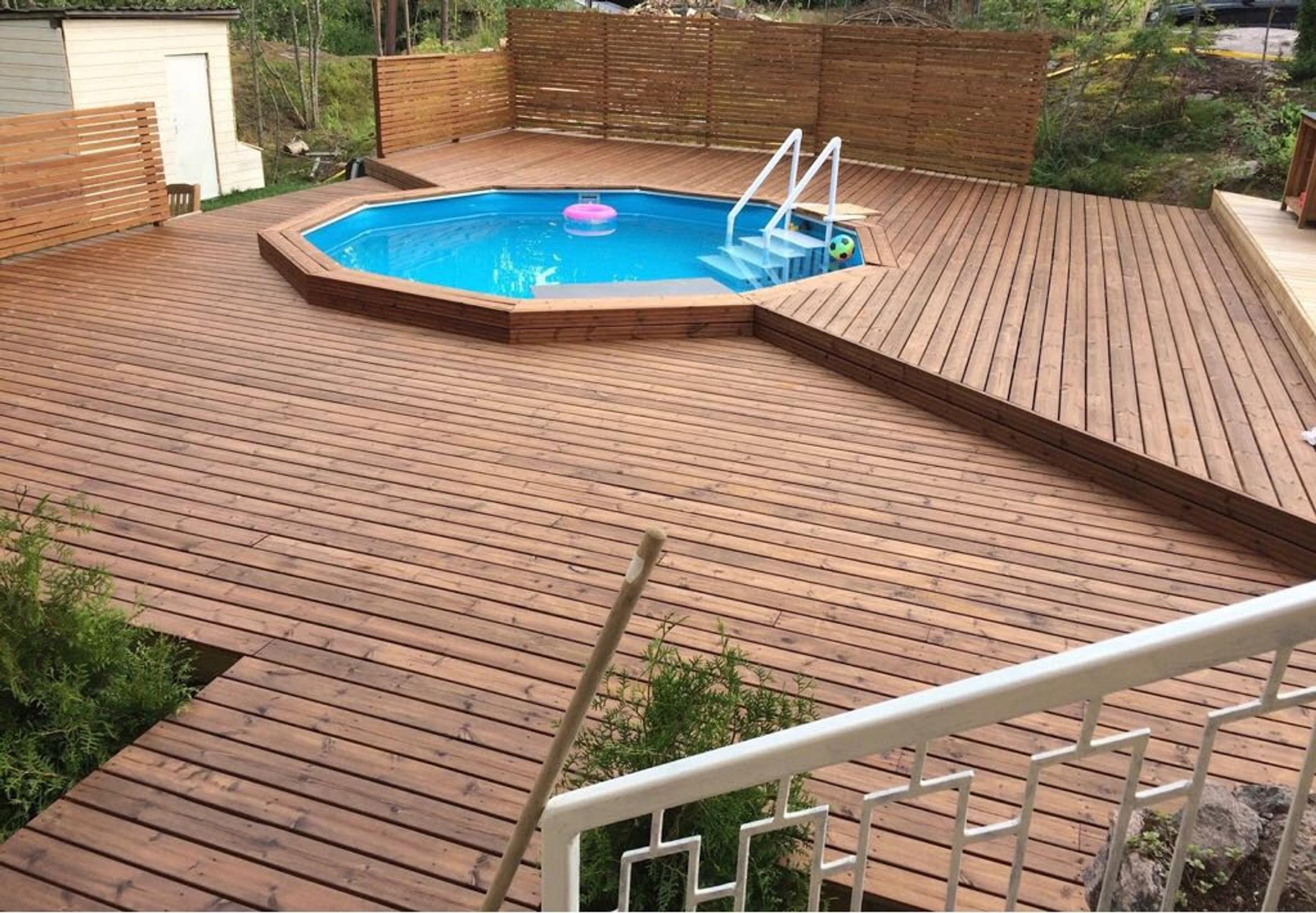 Käyttökustannuksia tulee veden hoitoon tarvittavista kemikaaleista, ja välillä uusimme suodattimen hiekat. Myöhemmin olemme rakentaneet uima-altaan ympärille terassin ja altaan viereen 10 hengen paljun.