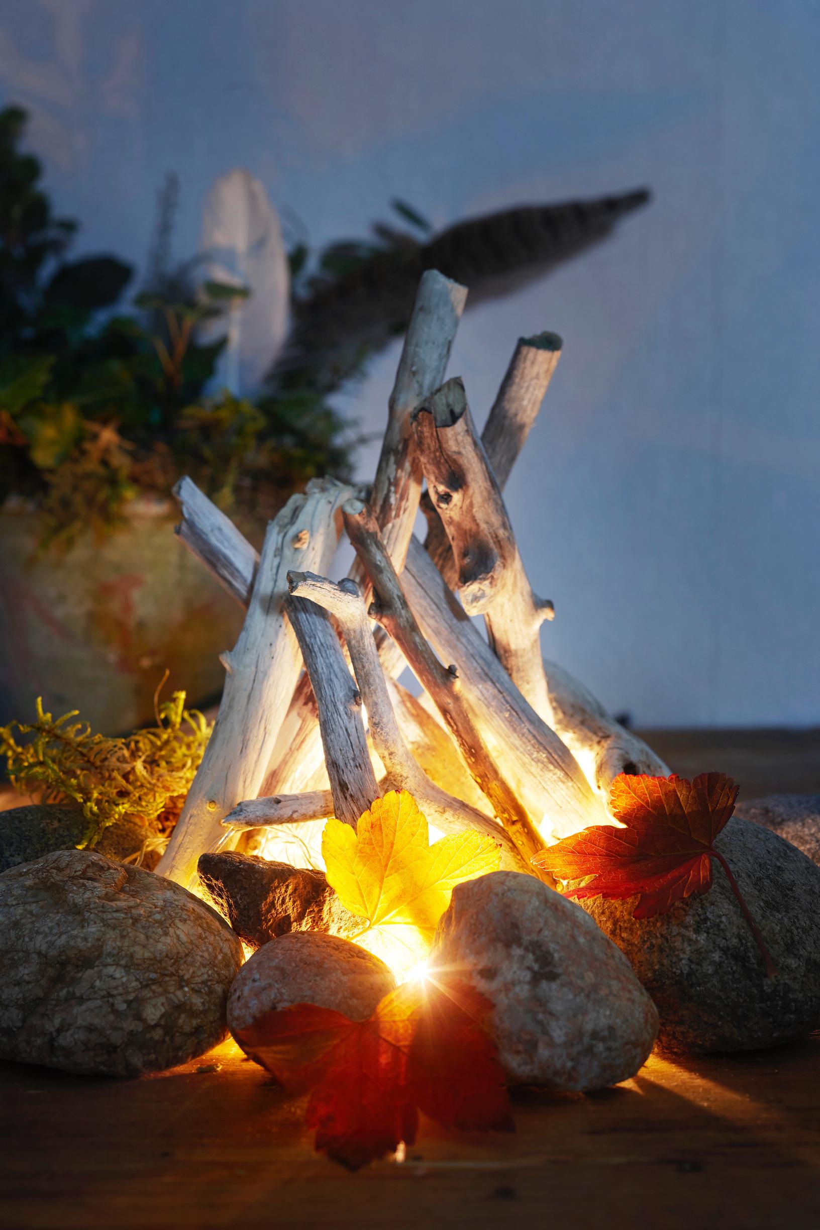 Kerää ajopuun pätkiä tai sopivia klapeja ja kokoa niistä nuotion muotoinen keko. Asettele myös keon ympärille kiviä kuin oikeassa nuotiossa ainakin! Koko komeuden viimeistelee nuotion sisälle sujautettava led-valosarja, joka valaisee iltahämärissä. Tämän paloturvallisen retkinuotion voit kasata huoletta vaikka parvekkeelle!