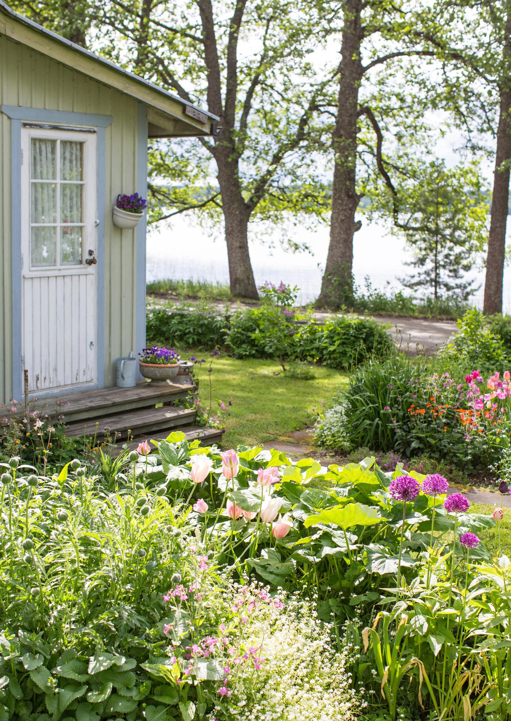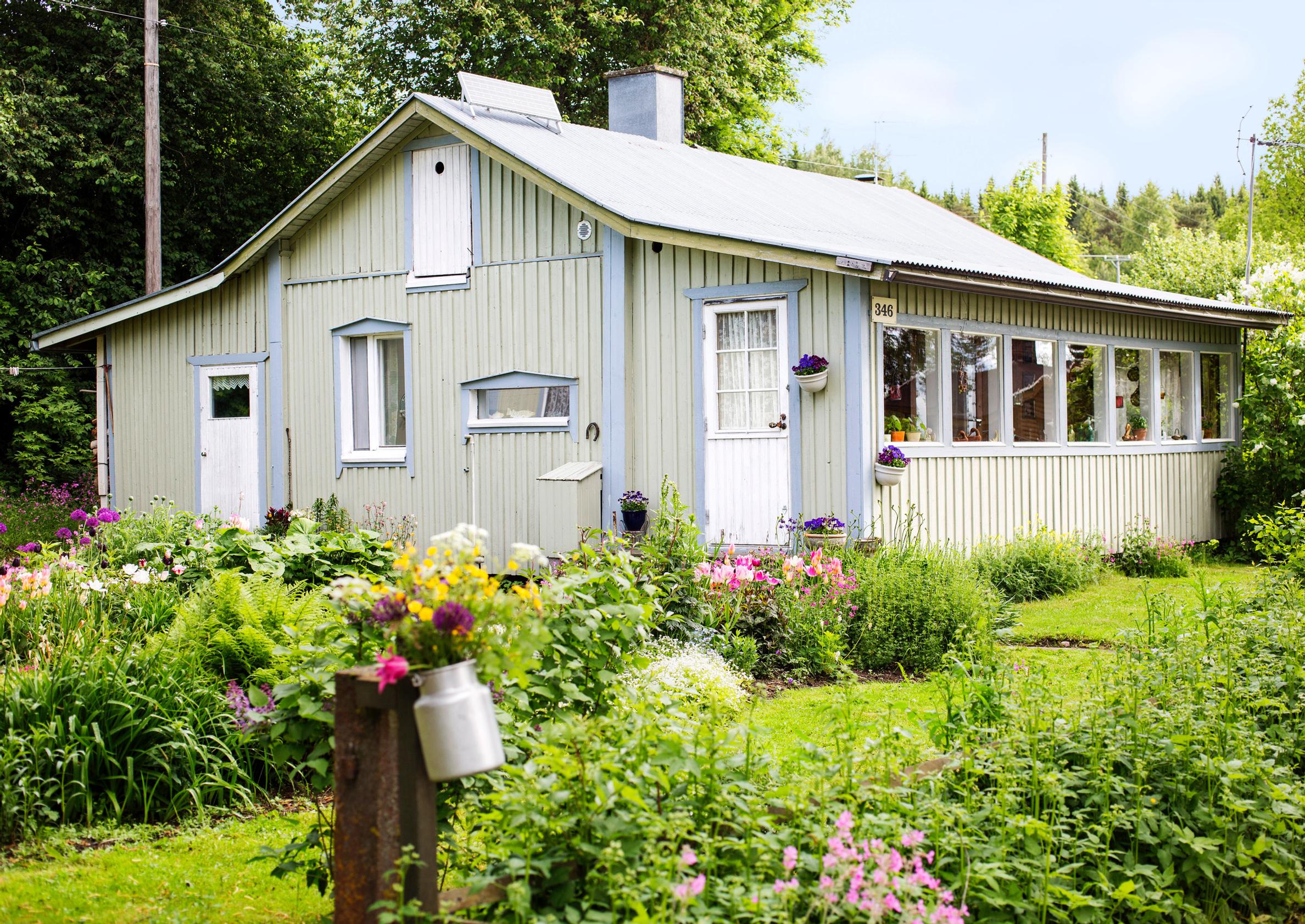 Vaaleanvihertävä mökki istuu kauniisti rehevien kukkapenkkien ja kimmeltävän veden välissä. Tämä mökki voisi löytyä vain täältä: Kukkiajärven rannalta.