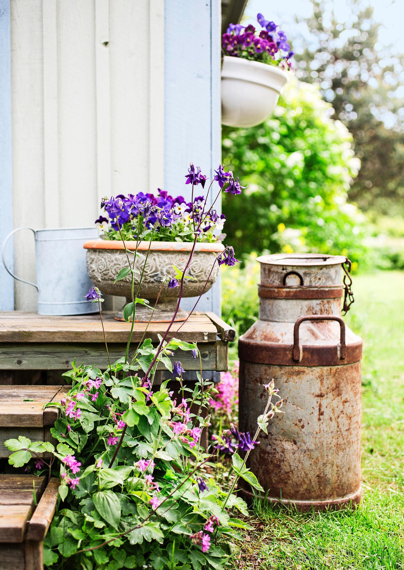 Yrtit Sari istutti osaksi perennapenkkejä. Perhosia keräävän mäkimeiramin lisäksi siellä kasvaa ruohosipulia ja minttua. Mökkiruokaa Sari maustaa penkistä keräämillään yrteillä.