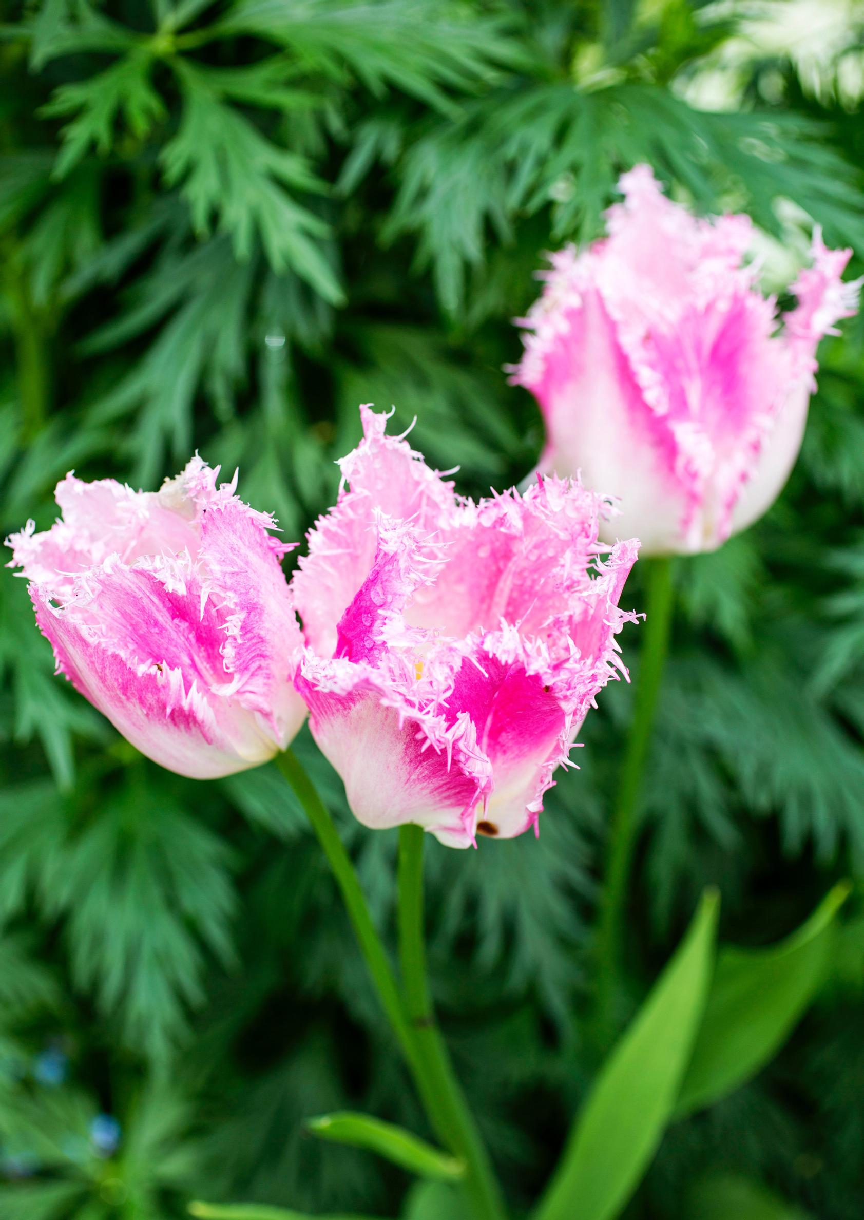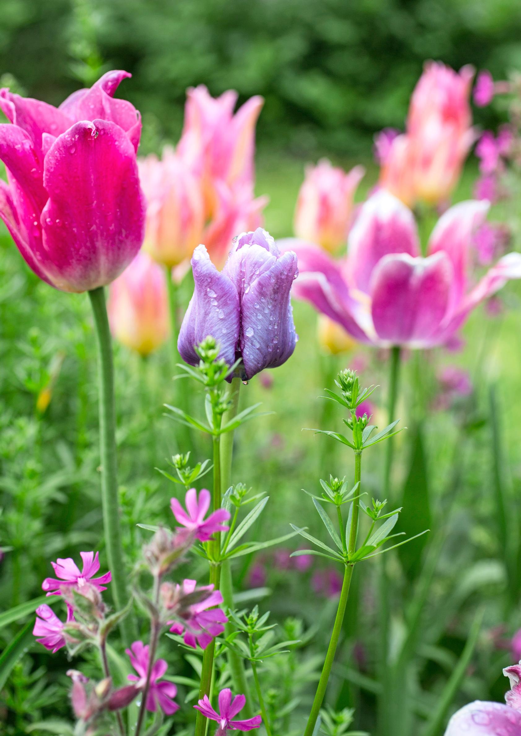 Viiden touhukkaan kesän jälkeen puutarha näyttää varsin erilaiselta kuin alussa. Kukkiaan availevat tarhakurjenmiekat ovat vanhaa, perinteistä kantaa. Tulppaanit taivuttelevat päitään perennapenkkien väleissä. Viime syksynä Sari kaivoi tulppaanimaahan rimpsureunaisen ´Huis ten Boschin´ ja liljakukkaisen ´Blushing Ladyn´.