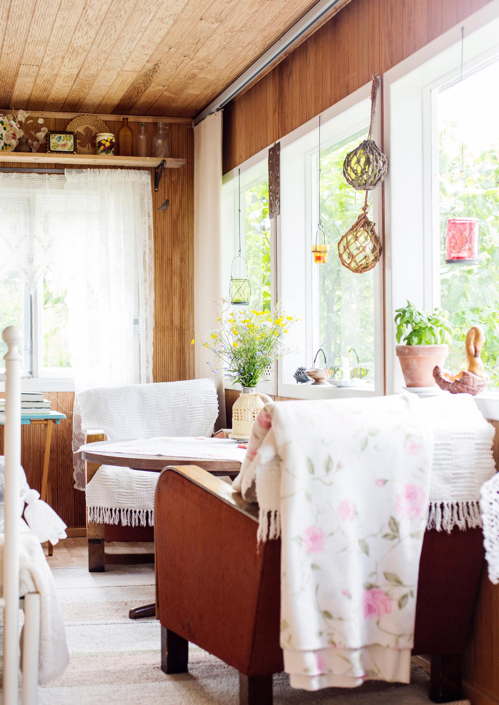 Lasikuisti liittyy iltapäivän parhaisiin hetkiin, sillä sen levitettävä sohva on kaikkein makein päiväunipaikka. Ikkunoista avautuu näkymä vanhojen tervaleppien miehittämään rantaan. Juhannusruusu avaa kukkansa aivan kiinni ikkunaan.