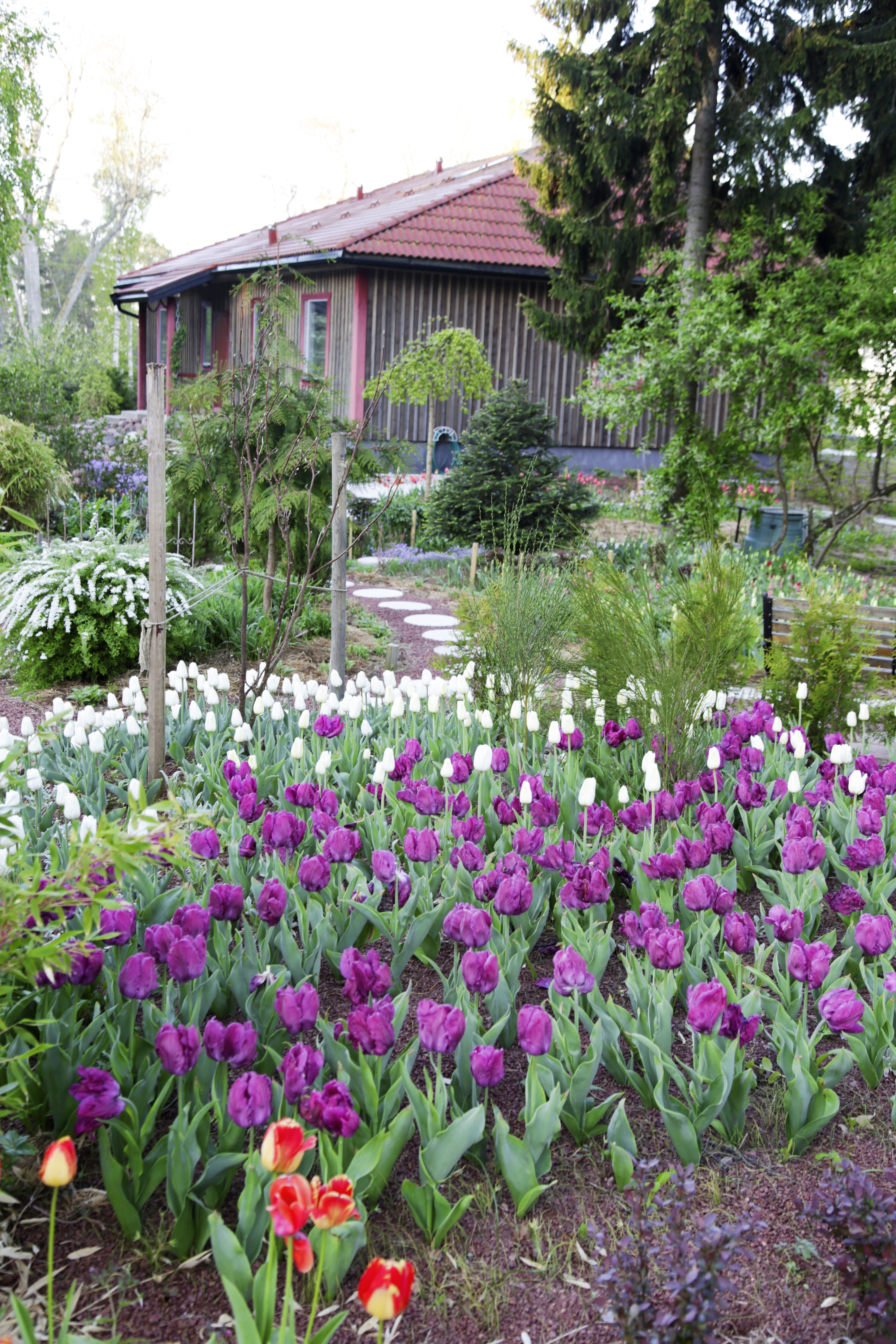 Birgitan ja Marcuksen puutarha Ahvenanmaalla on mykistävä näky – pariskunta on istuttanut sinne 100 000 sipulikukkaa. Kuvassa etualalla muutama punakeltainen darwinhybriditulppaani 'Banja Luka', niiden yläpuolella 'Blue Parrot' -papukaijatulppaaneja ja taaempana valkoisia 'Antarctica'-triumftulppaaneja.