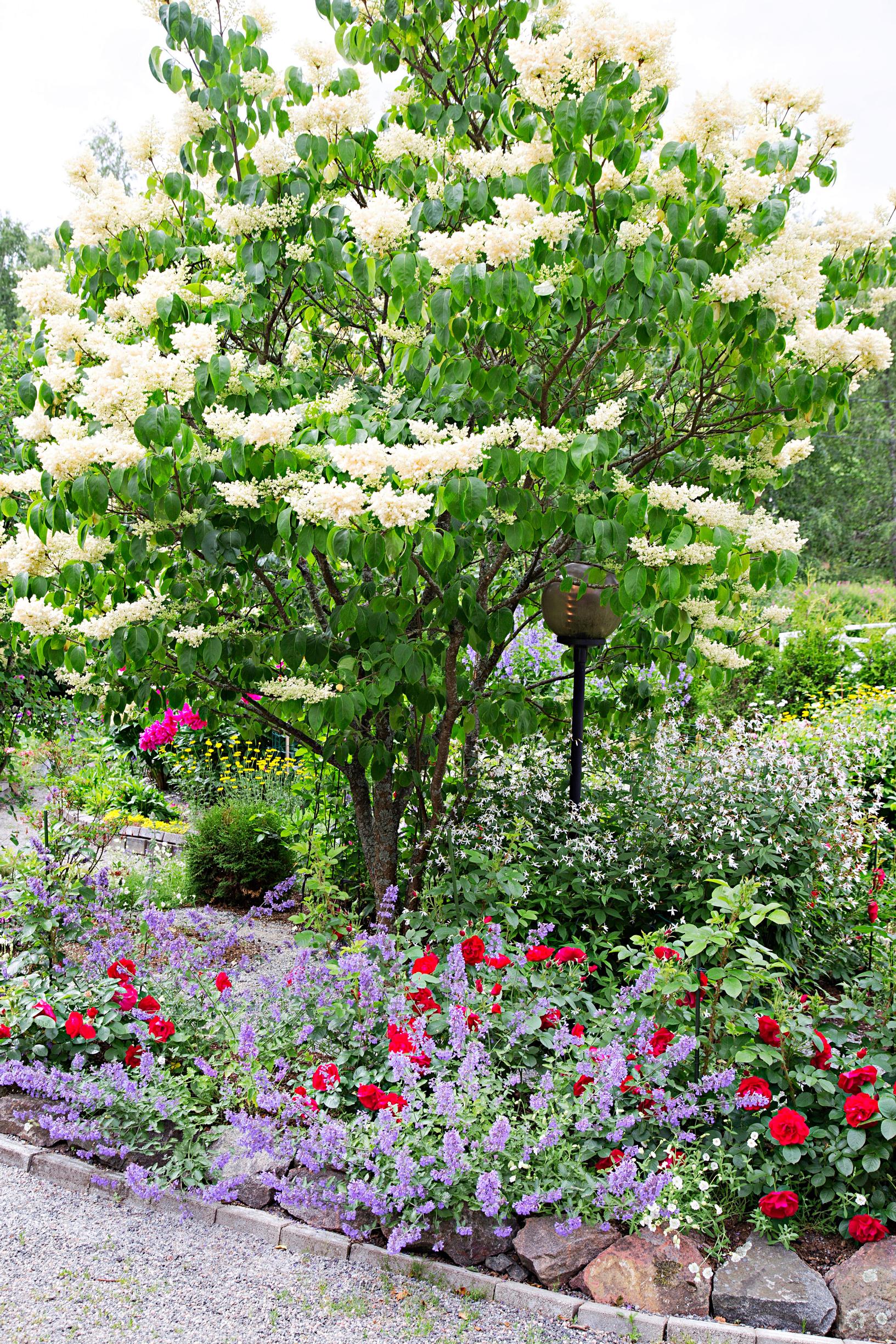 Raisiolaisessa puutarhassa kukkapenkin runsautta täydentää vuolaan valkoisena kukkiva likusterisyreeni. Etualalla kukkivat punaiset ’Hansaland’-ruusut ja ’Six Hills Giant’ -isomirrinmintut.