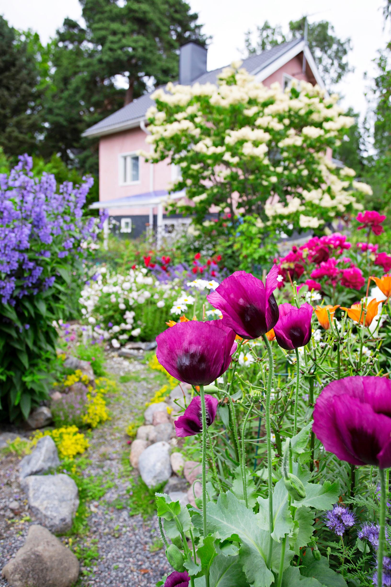 "Paikka on hirveää ryteikköä, laittakaa pitkät housut ja saappaat", varoitteli myyjä Tainaa ja Anttia, kun he menivät ensikertaa katsomaan mökkiään ja sen pihaa Varsinais-Suomen Mynämäelle. Kovan työn tuloksena puutarha on muuttunyt mummolamaiseksi idylliksi. Ensimmäisinä vuosina Taina jakoi ahkerasti perennoja kukinnan kustannuksella. Sen ansiosta kukkapenkki on nyt rehevä. Penkissä loistavat esimerkiksi unikot, jalopähkämöt ja pionit.