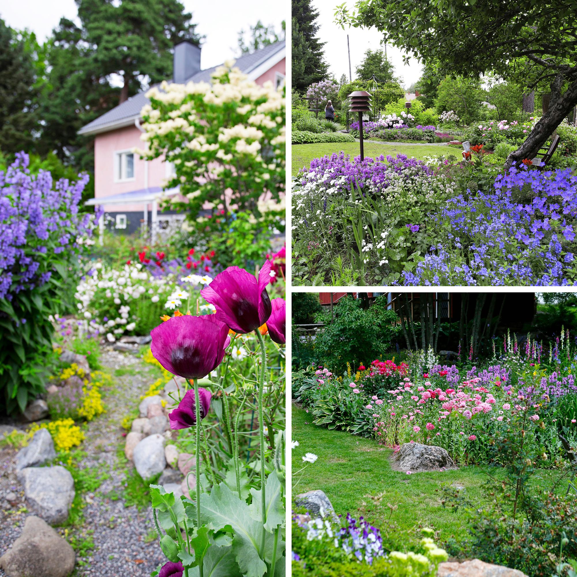 Ruusujen runsautta, tulppaanitykitystä, kukkia kaikissa sateenkaaren väreissä. Näitä suomalaispuutarhojen kukkaistutuksia voisi ihastella vaikka kuinka pitkään. Poimi inspiraatiota omaan koti- tai mökkipuutarhaasi!