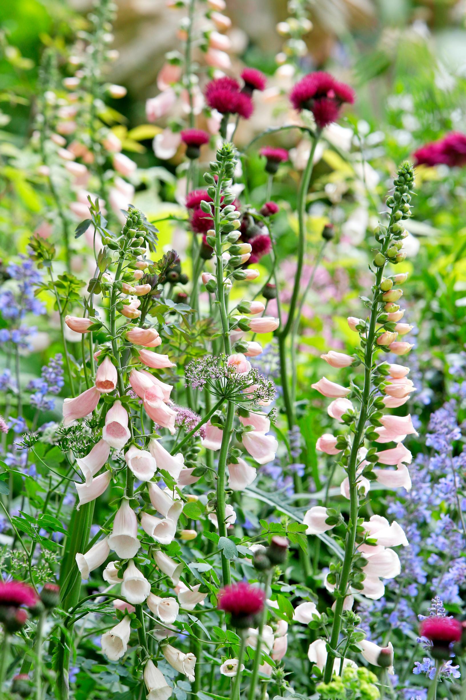 Käytännöllisyydestä viis, kunhan sykähdyttää, on Minnan puutarhamotto. Hänen mielestään kaikki kukkien värit ovat ihania. Tässä kukkivat sulassa sovussa esimerkiksi oranssit ruskoliljat ja violetinpunaiset sormustinkukat värikkäässä loviisalaispuutarhassa.
