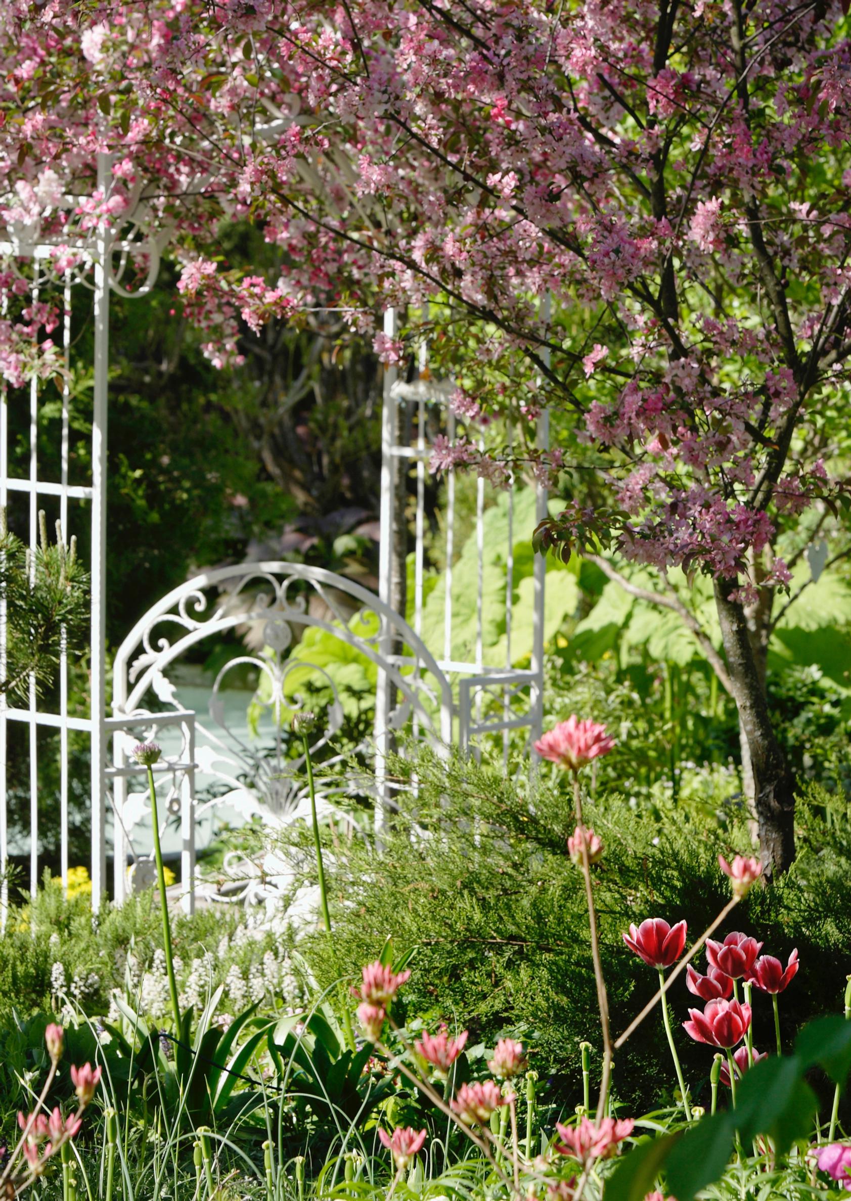 Koristeomenapuut ja tulppaanit tuovat punaisen kukkaloiston sävyjä puutarhaan. Parhaassa tapauksessa ne kukkivat yhtä aikaa alkukesällä!