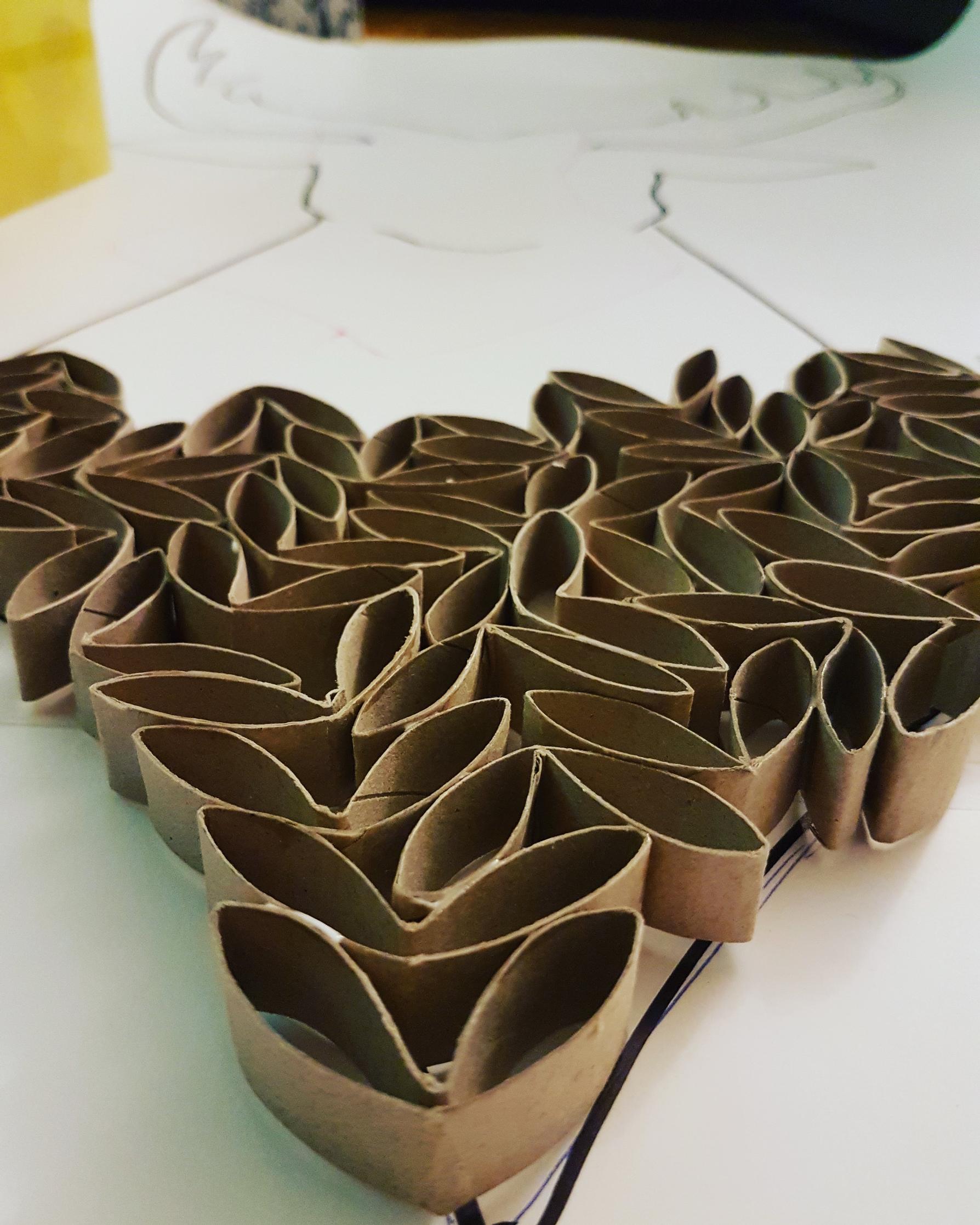 Seuraavaksi aloin leikata vessa- ja talouspaperihylsyjä renkaiksi. Painoin ensin koko hylsyn "kasaan" ja leikkasin sen noin puolen sentin renkaiksi. Sen jälkeen taitoin renkaan vielä kerran, niin että se muistutti hieman linnun nokkaa.